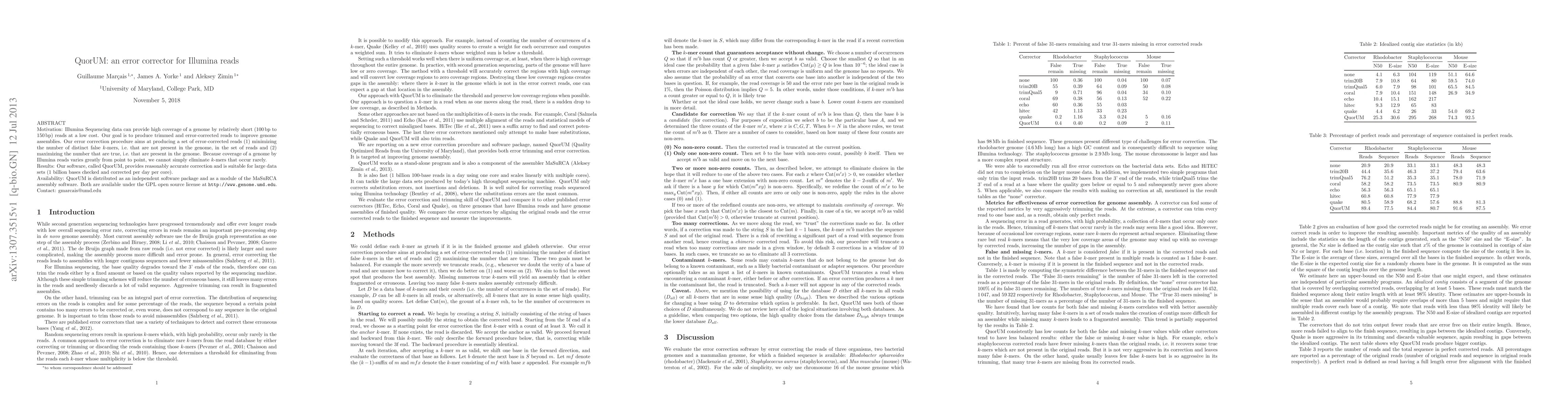 Motivation: Illumina Sequencing data can provide high coverage of a genome by relatively short (100 bp150 bp) reads at a low cost. Our goal is to produce trimmed and error-corrected reads to improve genome assemblies. Our error correction procedure aims at producing a set of error-corrected reads (1) minimizing the number of distinct false k-mers, i.e. that are not present in the genome, in the set of reads and (2) maximizing the number that are true, i.e. that are present in the genome. Because coverage of a genome by Illumina reads varies greatly from point to point, we cannot simply eliminate k-mers that occur rarely. Results: Our software, called QuorUM, provides reasonably accurate correction and is suitable for large data sets (1 billion bases checked and corrected per day per core). Availability: QuorUM is distributed as an independent software package and as a module of the MaSuRCA assembly software. Both are available under the GPL open source license at http://www.genome.umd.edu. Contact: [email protected]