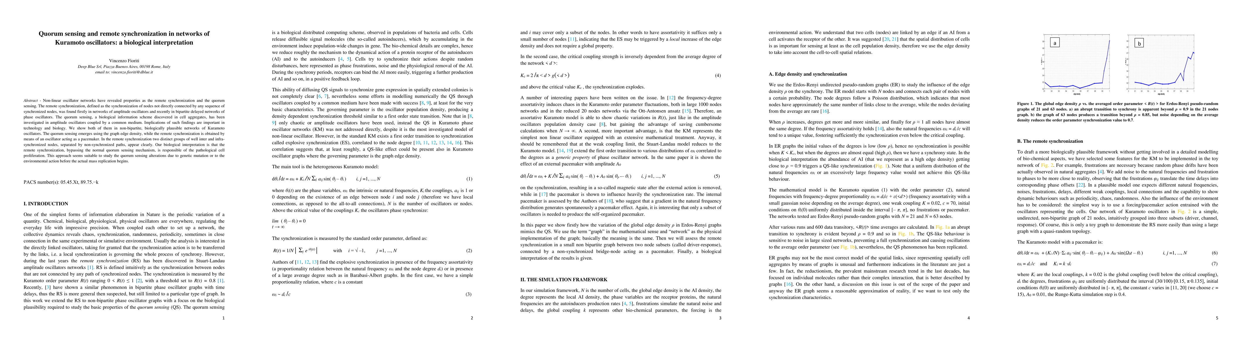 The paper presents a modified Kuramoto model incorporating a pacemaker for remote synchronization and quorum sensing based on edge density in Erdos-Renyi graphs, demonstrating its potential for modeling biological phenomena.