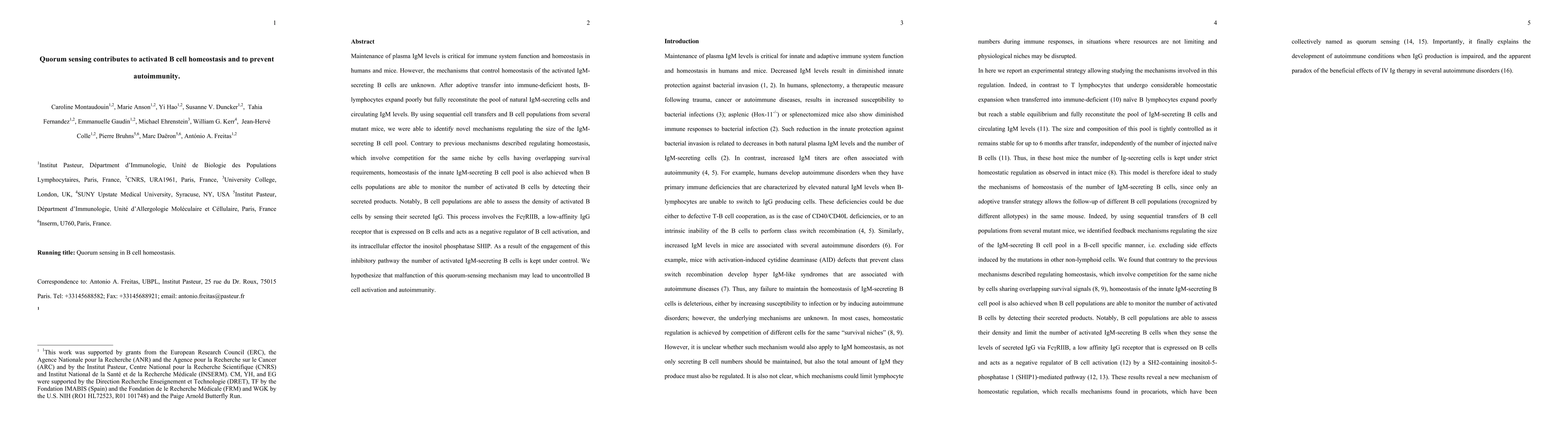 This research identifies quorum sensing as a novel mechanism regulating the homeostasis of activated IgM-secreting B cells, involving the detection of secreted IgG via Fc{\gamma}RIIB and SHIP to prevent autoimmunity. Malfunction in this quorum-sensing mechanism may lead to uncontrolled B cell activation and autoimmune diseases.