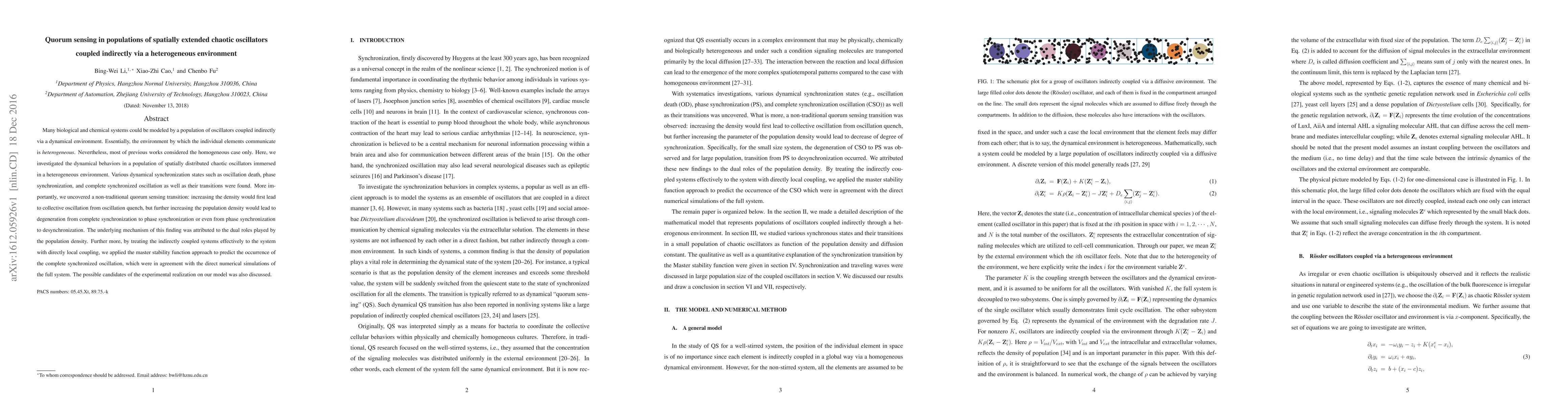 Many biological and chemical systems could be modeled by a population of oscillators coupled indirectly via a dynamical environment. Essentially, the environment by which the individual elements communicate is heterogeneous. Nevertheless, most of previous works considered the homogeneous case only. Here, we investigated the dynamical behaviors in a population of spatially distributed chaotic oscillators immersed in a heterogeneous environment. Various dynamical synchronization states such as oscillation death, phase synchronization, and complete synchronized oscillation as well as their transitions were found. More importantly, we uncovered a non-traditional quorum sensing transition: increasing the density would first lead to collective oscillation from oscillation quench, but further increasing the population density would lead to degeneration from complete synchronization to phase synchronization or even from phase synchronization to desynchronization. The underlying mechanism of this finding was attributed to the dual roles played by the population density. Further more, by treating the indirectly coupled systems effectively to the system with directly local coupling, we applied the master stability function approach to predict the occurrence of the complete synchronized oscillation, which were in agreement with the direct numerical simulations of the full system. The possible candidates of the experimental realization on our model was also discussed.