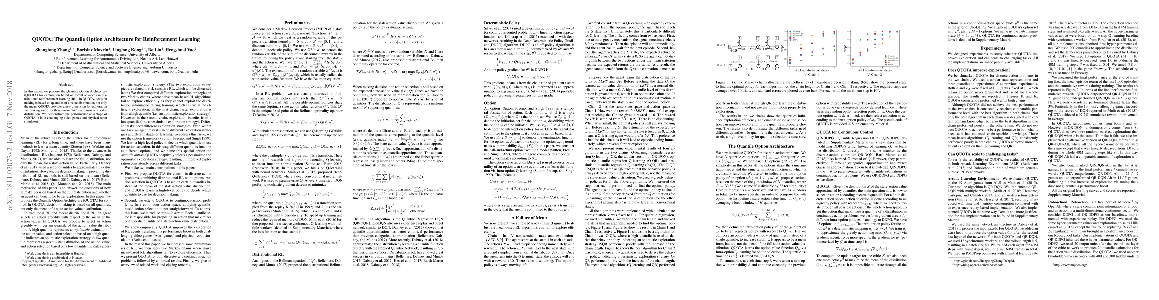 Summary: The paper introduces QUOTA, a Quantile Option Architecture for reinforcement learning that enhances exploration by considering quantiles of value distributions rather than just means. It demonstrates superior performance in both video games and robot simulators.