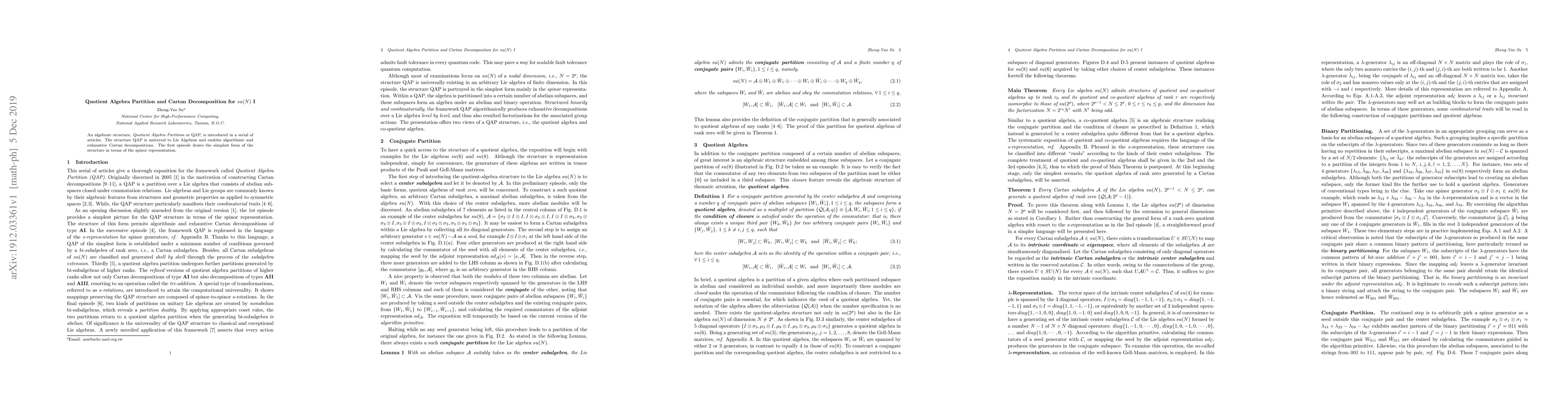 This paper introduces the Quotient Algebra Partition (QAP), a universal structure for Lie Algebras, which facilitates algorithmic and comprehensive Cartan decompositions. The focus is on illustrating the simplest form of QAP using the spinor representation of su(N).