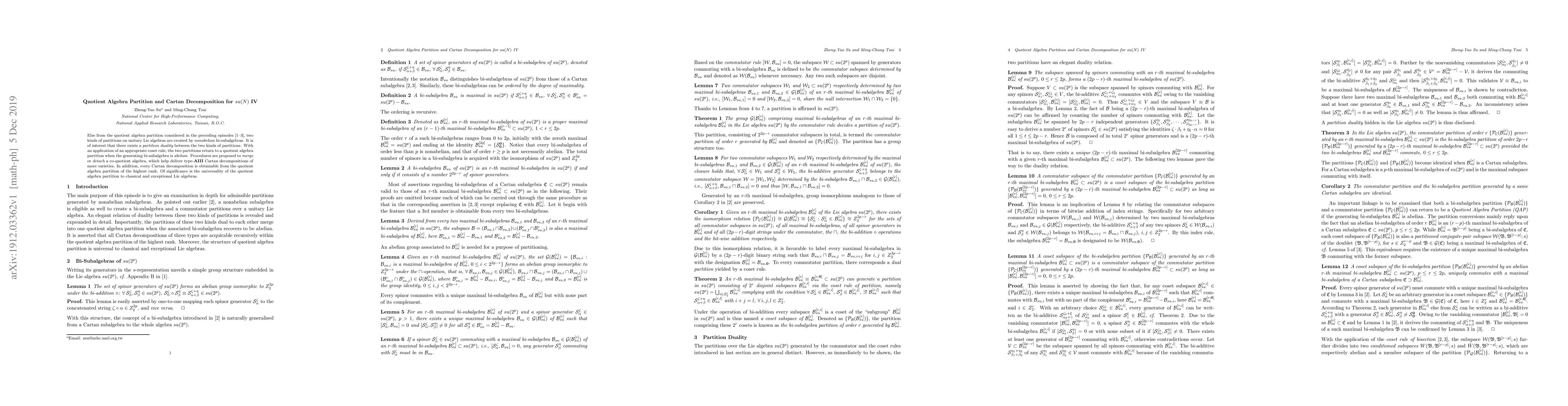 The research employs quotient algebra partition and Cartan decomposition techniques for su(N), extending previous episodes to create partitions on unitary Lie algebras using nonabelian bi-subalgebras. It establishes a duality between two partition types and shows how an appropriate coset rule can revert to a quotient algebra partition when the bi-subalgebra is abelian.