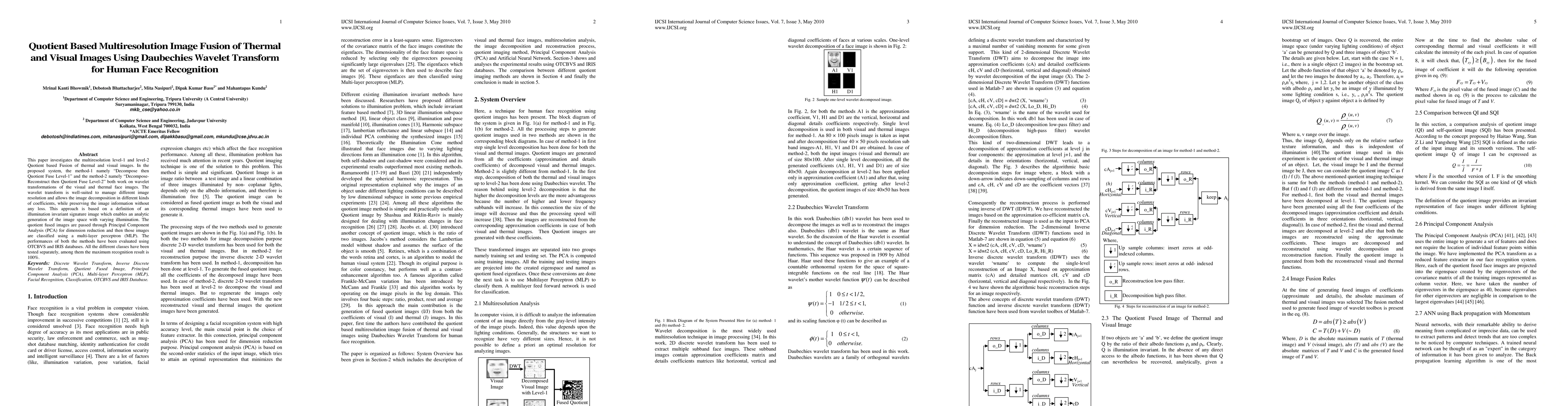 This paper investigates the multiresolution level-1 and level-2 Quotient based Fusion of thermal and visual images. In the proposed system, the method-1 namely "Decompose then Quotient Fuse Level-1" and the method-2 namely "Decompose-Reconstruct then Quotient Fuse Level-2" both work on wavelet transformations of the visual and thermal face images. The wavelet transform is well-suited to manage different image resolution and allows the image decomposition in different kinds of coefficients, while preserving the image information without any loss. This approach is based on a definition of an illumination invariant signature image which enables an analytic generation of the image space with varying illumination. The quotient fused images are passed through Principal Component Analysis (PCA) for dimension reduction and then those images are classified using a multi-layer perceptron (MLP). The performances of both the methods have been evaluated using OTCBVS and IRIS databases. All the different classes have been tested separately, among them the maximum recognition result is 100%.