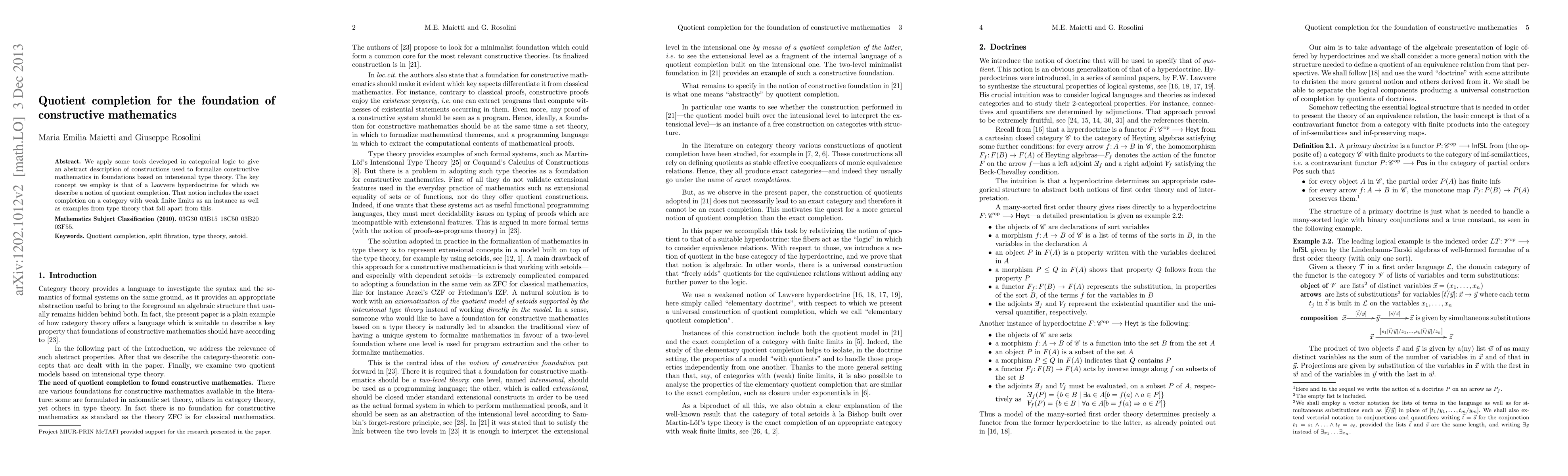 We apply some tools developed in categorical logic to give an abstract description of constructions used to formalize constructive mathematics in foundations based on intensional type theory. The key concept we employ is that of a Lawvere hyperdoctrine for which we describe a notion of quotient completion. That notion includes the exact completion on a category with weak finite limits as an instance as well as examples from type theory that fall apart from this.