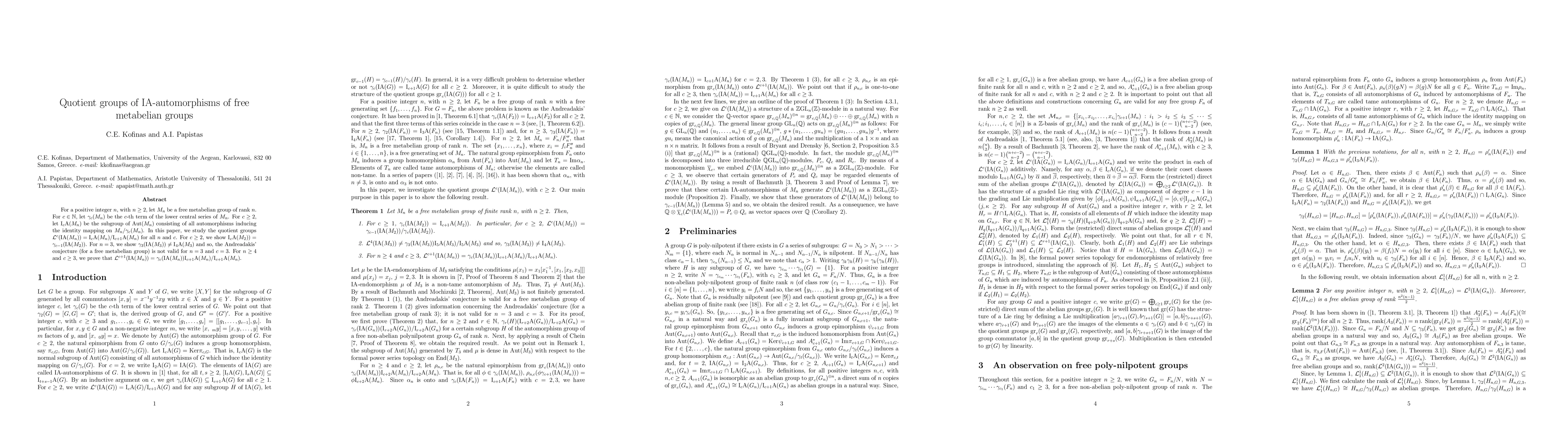 For a positive integer $n$, with $n \geq 2$, let $M_n$ be a free metabelian group of rank $n$. For $c \in \mathbb{N}$, let $\gamma_c(M_n)$ be the $c$-th term of the lower central series of $M_n$. For $c \geq 2$, let ${\rm I}_{c}{\rm A}(M_n)$ be the subgroup of ${\rm Aut}(M_{n})$ consisting of all automorphisms inducing the identity mapping on $M_n/\gamma_c(M_n)$. In this paper, we study the quotient groups ${\cal L}^{c}({\rm IA}(M_{n})) = {\rm I}_{c}{\rm A}(M_n)/{\rm I}_{c+1}{\rm A}(M_n)$ for all $n$ and $c$. For $c \geq 2$, we show $\gamma_{c}({\rm IA}(M_{2})) = {\rm I}_{c+1}{\rm A}(M_{2}))$. For $n = 3$, we show $\gamma_{3}({\rm IA}(M_{3})) \neq {\rm I}_{4}{\rm A}(M_{3})$ and so, the Andreadakis' conjecture (for a free metabelian group) is not valid for $n = 3$ and $c = 3$. For $n \geq 4$ and $c \geq 3$, we prove that ${\cal L}^{c}({\rm IA}(M_{n})) = \gamma_{c-1}({\rm IA}(M_{n})){\rm I}_{c+1}{\rm A}(M_{n})/{\rm I}_{c+1}{\rm A}(M_{n})$.
