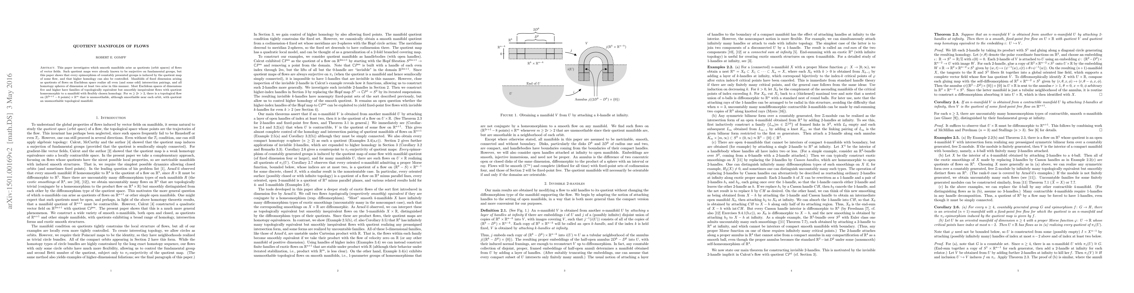 This paper explores smooth manifolds that emerge as quotients of vector field flows, demonstrating that every epimorphism of countably presented groups is induced by such a quotient and that higher homology can be controlled. It shows that specific Euclidean flows yield all even intersection pairings and homotopy spheres of dimension at least 2, and unsmoothable topological flows produce quotients that are unsmoothable as topological manifolds.