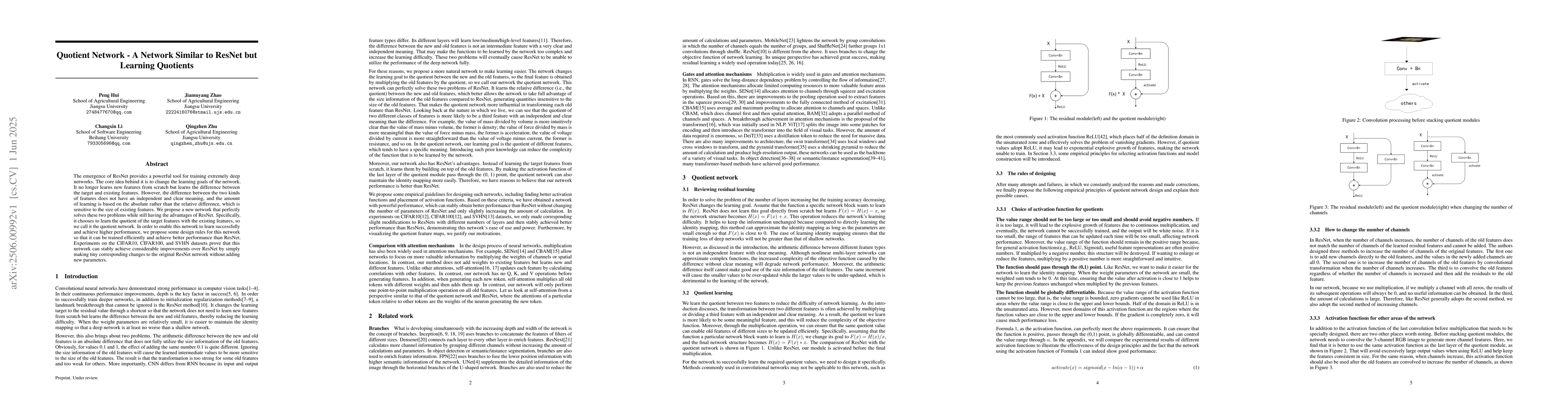 The paper proposes a new network architecture, the Quotient Network, which learns the quotient of target features with existing features, addressing issues with ResNet's absolute difference-based learning.