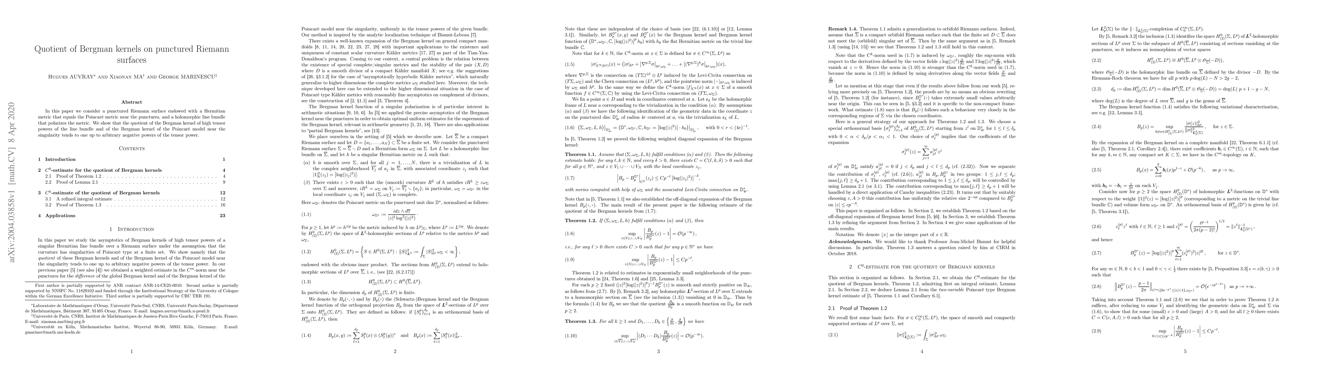 This paper investigates the quotient of Bergman kernels on a punctured Riemann surface with a Hermitian metric resembling the Poincaré metric near the punctures. It demonstrates that the ratio of Bergman kernels for high tensor powers of a polarizing holomorphic line bundle approaches one, diminishing to negligible negative powers of the tensor power.