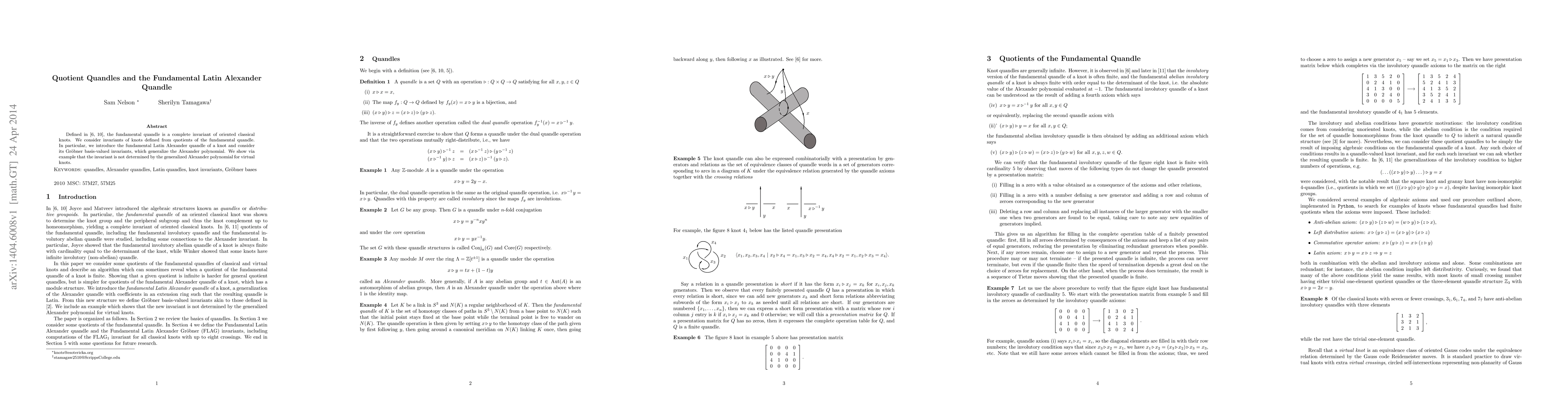 Defined by Joyce and Matveev, the fundamental quandle is a complete invariant of oriented classical knots. We consider invariants of knots defined from quotients of the fundamental quandle. In particular, we introduce the fundamental Latin Alexander quandle of a knot and consider its Gr\"obner basis-valued invariants, which generalize the Alexander polynomial. We show via example that the invariant is not determined by the generalized Alexander polynomial for virtual knots.
