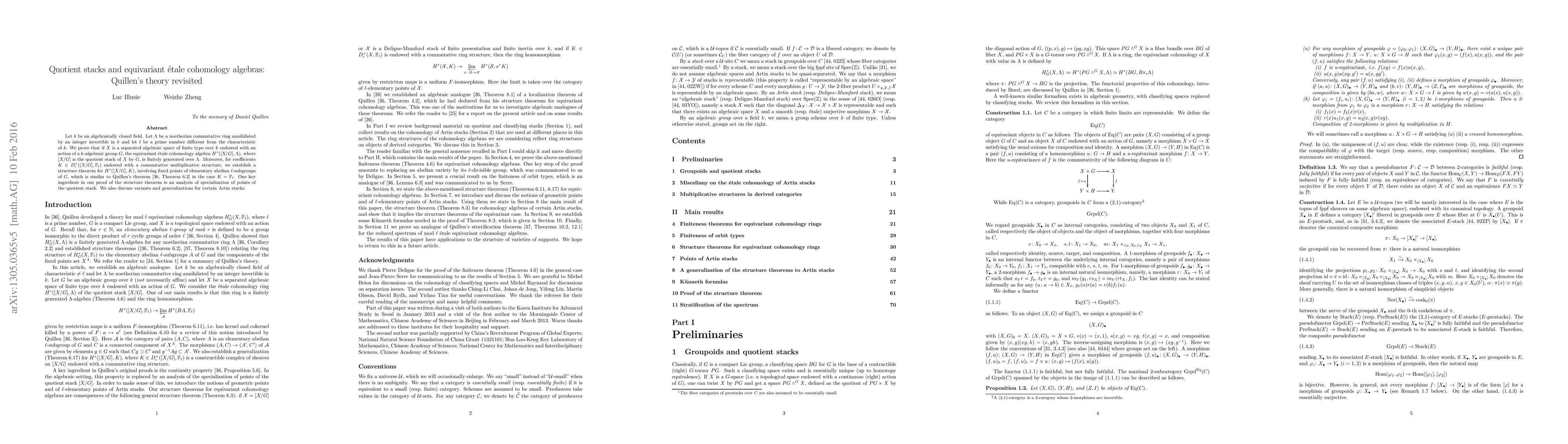 Let $k$ be an algebraically closed field. Let $\Lambda$ be a noetherian commutative ring annihilated by an integer invertible in $k$ and let $\ell$ be a prime number different from the characteristic of $k$. We prove that if $X$ is a separated algebraic space of finite type over $k$ endowed with an action of a $k$-algebraic group $G$, the equivariant \'etale cohomology algebra $H^*([X/G],\Lambda)$, where $[X/G]$ is the quotient stack of $X$ by $G$, is finitely generated over $\Lambda$. Moreover, for coefficients $K \in D^+_c([X/G],\mathbb{F}_{\ell})$ endowed with a commutative multiplicative structure, we establish a structure theorem for $H^*([X/G],K)$, involving fixed points of elementary abelian $\ell$-subgroups of $G$, which is similar to Quillen's theorem in the case $K = \mathbb{F}_{\ell}$. One key ingredient in our proof of the structure theorem is an analysis of specialization of points of the quotient stack. We also discuss variants and generalizations for certain Artin stacks.