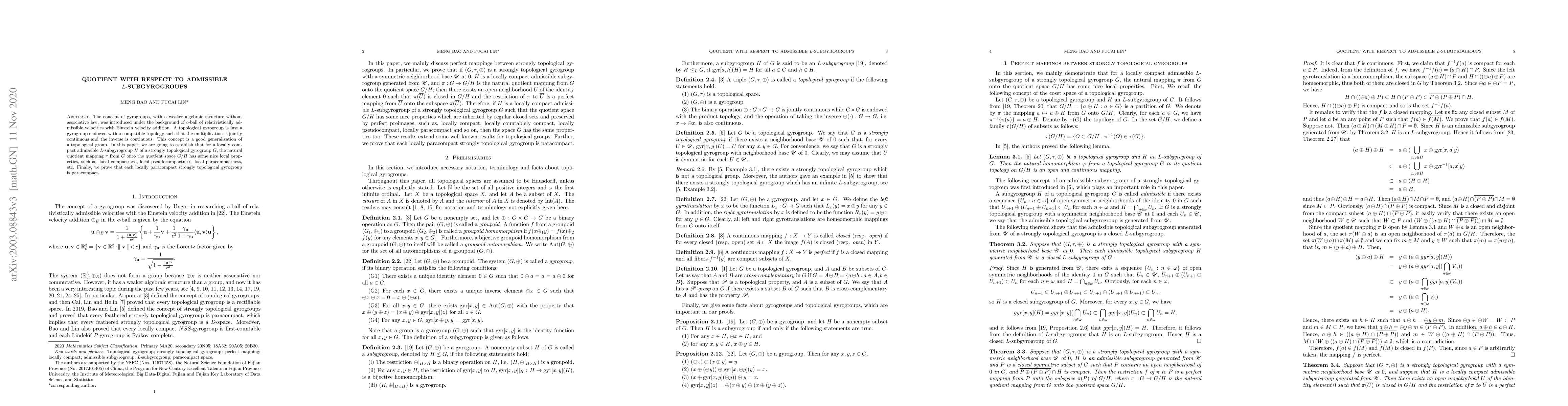 The concept of gyrogroups, with a weaker algebraic structure without associative law, was introduced under the background of $c$-ball of relativistically admissible velocities with Einstein velocity addition. A topological gyrogroup is just a gyrogroup endowed with a compatible topology such that the multiplication is jointly continuous and the inverse is continuous. This concept is a good generalization of a topological group. In this paper, we are going to establish that for a locally compact admissible $L$-subgyrogroup $H$ of a strongly topological gyrogroup $G$, the natural quotient mapping $\pi$ from $G$ onto the quotient space $G/H$ has some nice local properties, such as, local compactness, local pseudocompactness, local paracompactness, etc. Finally, we prove that each locally paracompact strongly topological gyrogroup is paracompact.