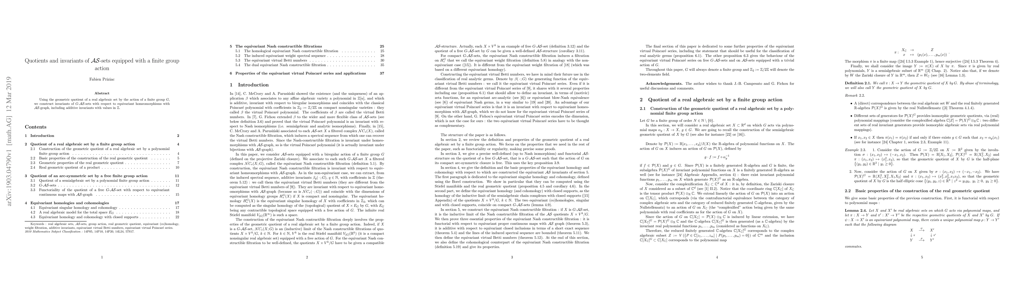 Using the geometric quotient of a real algebraic set by the action of a finite group G, we construct invariants of GAS sets with respect to equivariant homeomorphisms with AS-graph, including additive invariants with values in Z.