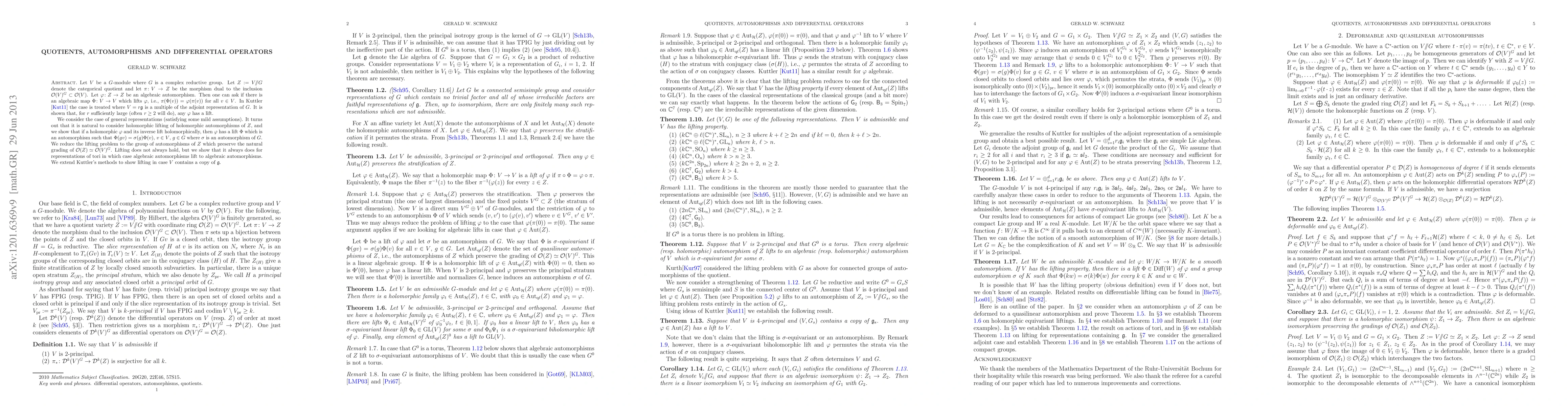 Let $V$ be a $G$-module where $G$ is a complex reductive group. Let $Z:=\quot VG$ denote the categorical quotient and let $\pi\colon V\to Z$ be the morphism dual to the inclusion $\O(V)^G\subset\O(V)$. Let $\phi\colon Z\to Z$ be an algebraic automorphism. Then one can ask if there is an algebraic map $\Phi\colon V\to V$ which lifts $\phi$, i.e., $\pi(\Phi(v))=\phi(\pi(v))$ for all $v\in V$. In \cite{Kuttler} the case is treated where $V=r\lieg$ is a multiple of the adjoint representation of $G$. It is shown that, for $r$ sufficiently large (often $r\geq 2$ will do), any $\phi$ has a lift. We consider the case of general representations (satisfying some mild assumptions). It turns out that it is natural to consider holomorphic lifting of holomorphic automorphisms of $Z$, and we show that if a holomorphic $\phi$ and its inverse lift holomorphically, then $\phi$ has a lift $\Phi$ which is an automorphism such that $\Phi(gv)=\sigma(g)\Phi(v)$, $v\in V$, $g\in G$ where $\sigma$ is an automorphism of $G$. We reduce the lifting problem to the group of automorphisms of $Z$ which preserve the natural grading of $\O(Z)\simeq\O(V)^G$. Lifting does not always hold, but we show that it always does for representations of tori in which case algebraic automorphisms lift to algebraic automorphisms. We extend Kuttler's methods to show lifting in case $V$ contains a copy of $\lieg$.