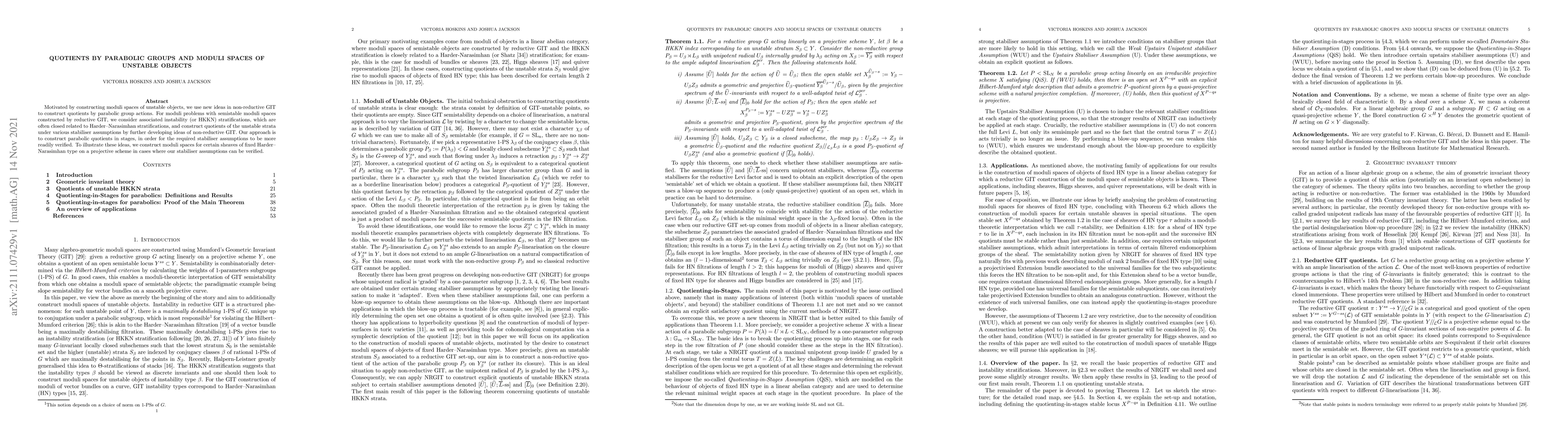 This paper constructs quotients by parabolic group actions using non-reductive GIT to build moduli spaces of unstable objects. It develops instability stratifications and constructs quotients in stages to verify stabiliser assumptions, illustrated through moduli spaces for specific sheaves on projective schemes.