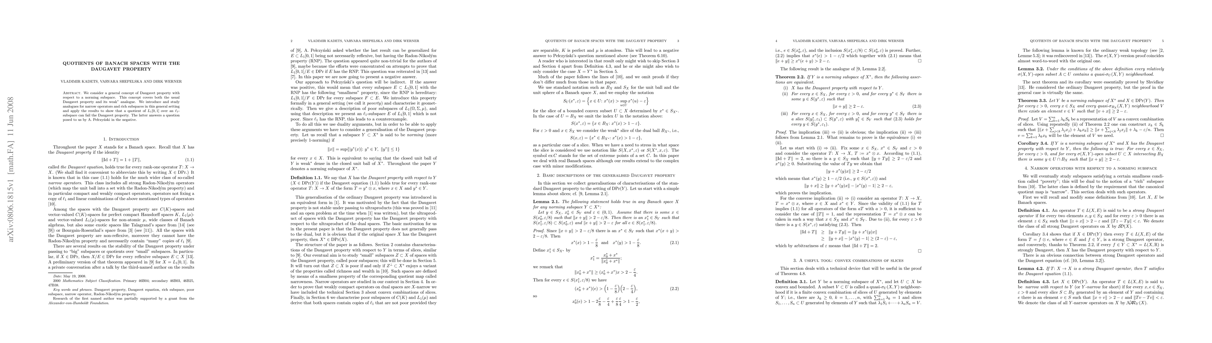 This paper explores the Daugavet property in Banach spaces relative to norming subspaces, demonstrating that quotients of $L_1[0,1]$ over $\ell_1$-subspaces can fail to possess this property, thus answering a question posed by A. Pelczynski negatively.