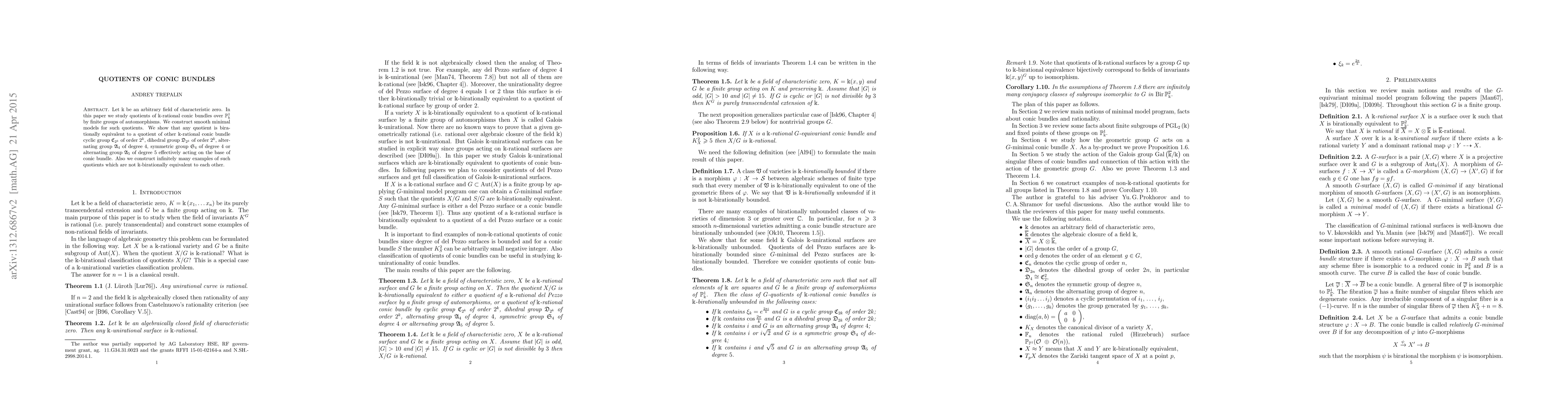 This paper investigates quotients of k-rational conic bundles over projective lines by finite automorphism groups, constructing smooth minimal models and proving birational equivalence to quotients by specific cyclic, dihedral, alternating, symmetric, or alternating groups. It also provides infinitely many distinct examples of such quotients.