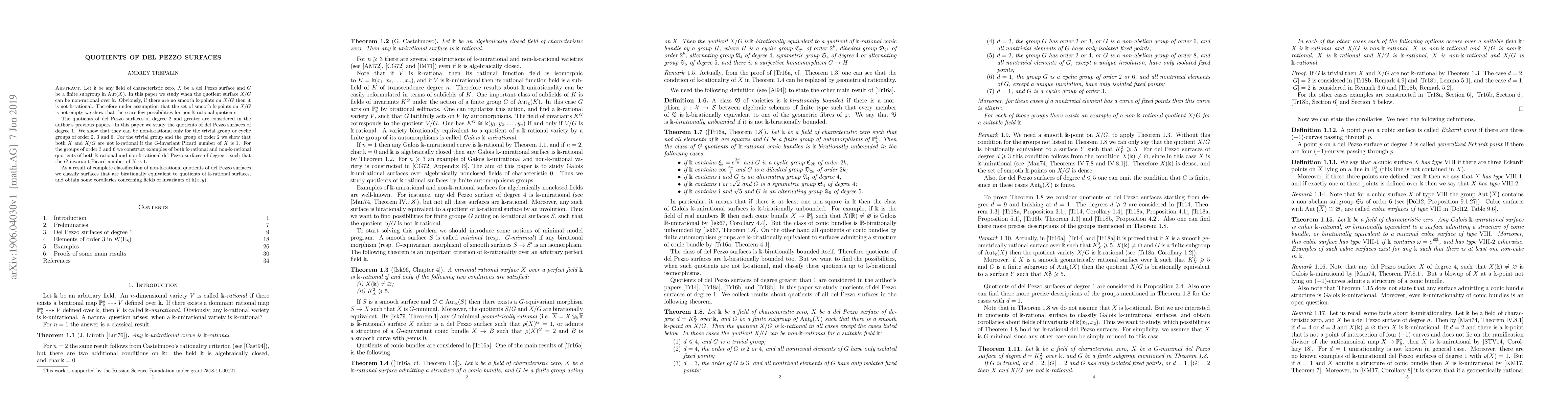 Let $\Bbbk$ be any field of characteristic zero, $X$ be a del Pezzo surface and $G$ be a finite subgroup in $\operatorname{Aut}(X)$. In this paper we study when the quotient surface $X / G$ can be non-rational over $\Bbbk$. Obviously, if there are no smooth $\Bbbk$-points on $X / G$ then it is not $\Bbbk$-rational. Therefore under assumption that the set of smooth $\Bbbk$-points on $X / G$ is not empty we show that there are few possibilities for non-$\Bbbk$-rational quotients. The quotients of del Pezzo surfaces of degree $2$ and greater are considered in the author's previous papers. In this paper we study the quotients of del Pezzo surfaces of degree $1$. We show that they can be non-$\Bbbk$-rational only for the trivial group or cyclic groups of order $2$, $3$ and $6$. For the trivial group and the group of order $2$ we show that both $X$ and $X / G$ are not $\Bbbk$-rational if the $G$-invariant Picard number of $X$ is $1$. For the groups of order $3$ and $6$ we construct examples of both $\Bbbk$-rational and non-$\Bbbk$-rational quotients of both $\Bbbk$-rational and non-$\Bbbk$-rational del Pezzo surfaces of degree $1$ such that the $G$-invariant Picard number of $X$ is $1$. As a result of complete classification of non-$\Bbbk$-rational quotients of del Pezzo surfaces we classify surfaces that are birationally equivalent to quotients of $\Bbbk$-rational surfaces, and obtain some corollaries concerning fields of invariants of $\Bbbk(x , y)$.