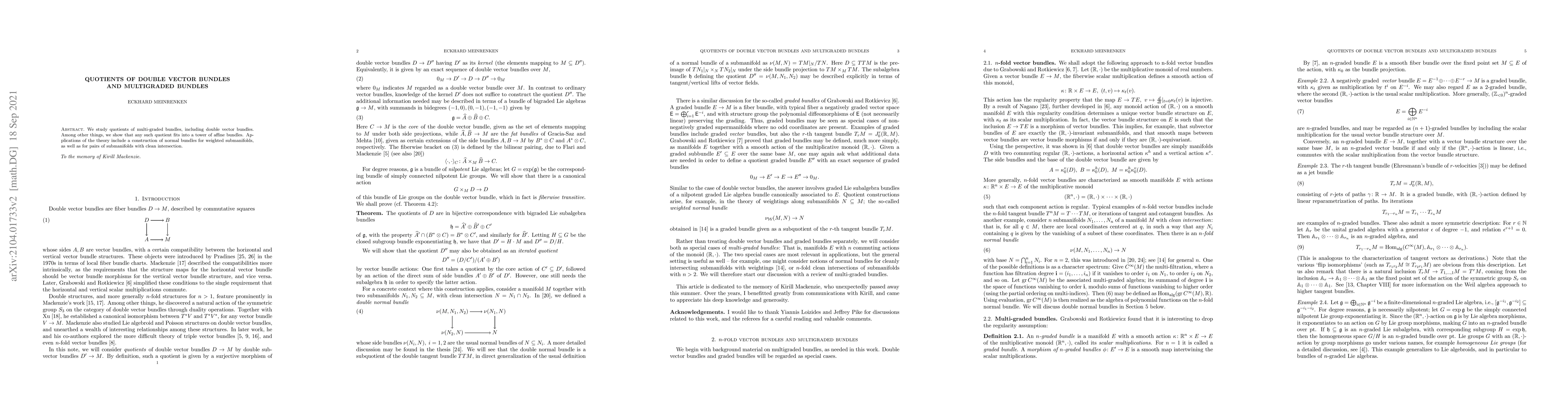 This paper investigates quotients of multi-graded bundles, particularly focusing on double vector bundles, and demonstrates that such quotients can be structured as a series of affine bundles. The research also applies this theory to construct normal bundles for weighted submanifolds and pairs of submanifolds with a clean intersection.