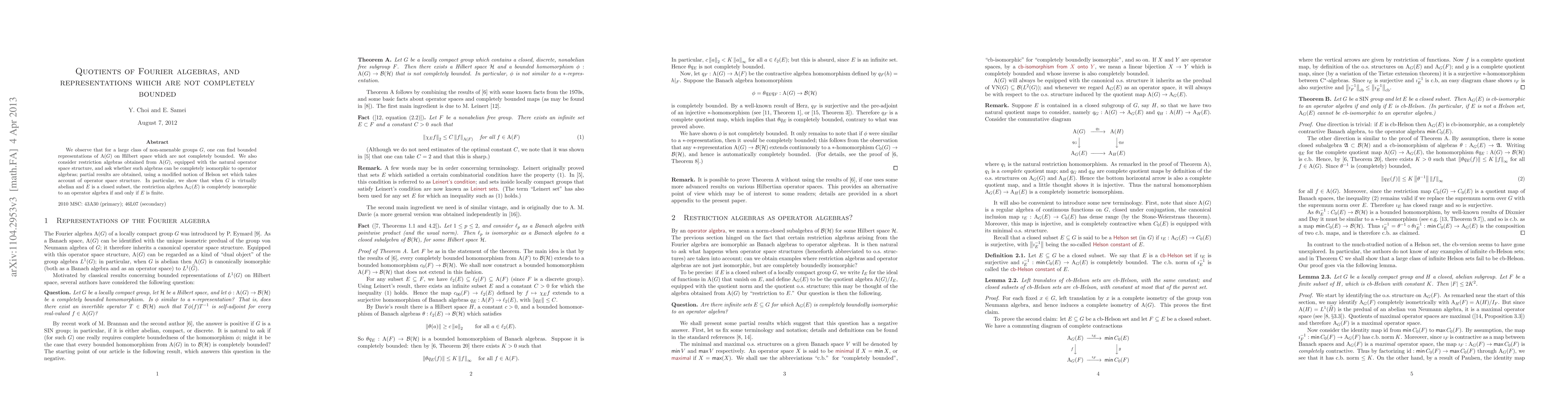 Summary: The paper investigates bounded representations of Fourier algebras $A(G)$ for non-amenable groups $G$, showing they can be bounded but not completely bounded. It also examines restriction algebras derived from $A(G)$, proving that if $G$ is virtually abelian, the restriction algebra $A_G(E)$ is completely isomorphic to an operator algebra if and only if $E$ is finite.