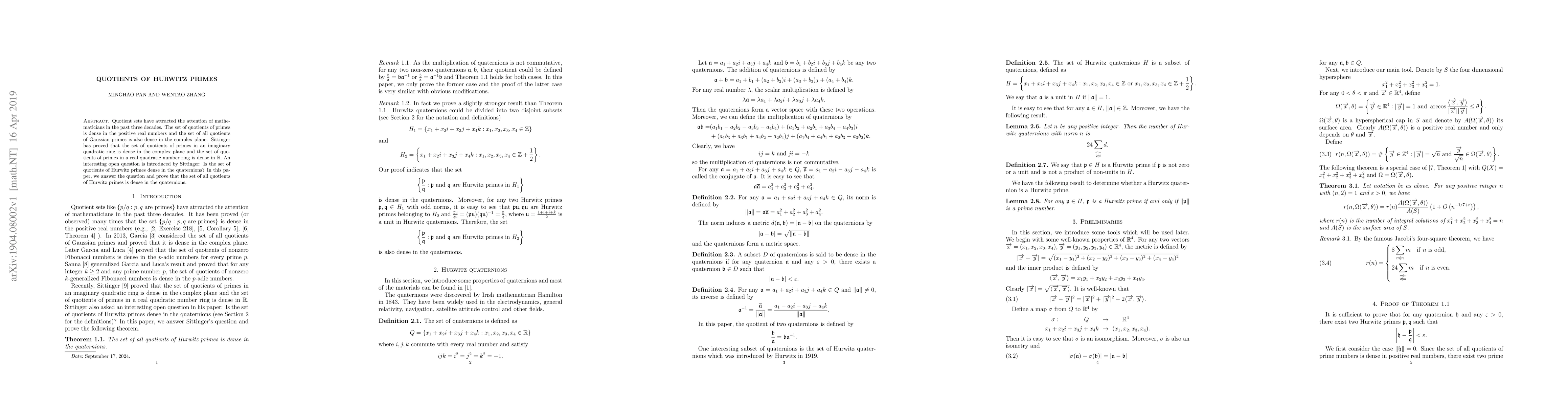 This paper proves that the set of quotients derived from Hurwitz primes is dense in the quaternions, answering a question posed by Sittinger and extending previous results on prime quotients in various number rings.