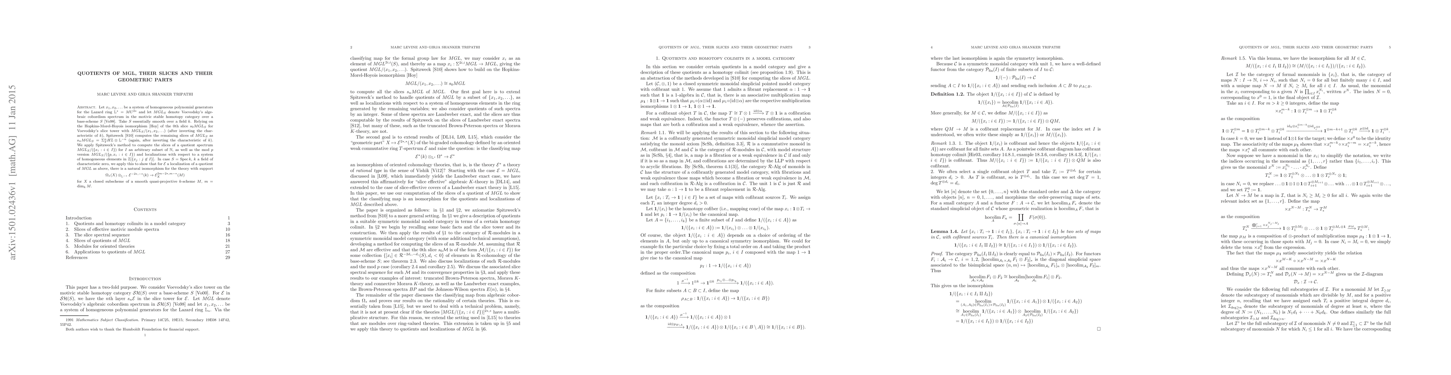 Let $x_1, x_2,\ldots$ be a system of homogeneous polynomial generators for the Lazard ring $\mathbb{L}^*=MU^{2*}$ and let $MGL_S$ denote Voevodsky's algebraic cobordism spectrum in the motivic stable homotopy category over a base-scheme $S$.Take $S$ essentially smooth over a field $k$. Relying on Hopkins-Morel-Hoyois isomorphism of the 0th slice $s_0MGL_S$ for Voevodsky's slice tower with $MGL_S/(x_1, x_2,\ldots)$ (after inverting the characteristic of $k$), Spitzweck computes the remaining slices of $MGL_S$ as $s_nMGL_S=\Sigma^n_TH\mathbb{Z}\otimes \mathbb{L}^{-n}$ (again, after inverting the characteristic of $k$). We apply Spitzweck's method to compute the slices of a quotient spectrum $MGL_S/(\{x_i:i\in I\})$ for $I$ an arbitrary subset of $\mathbb{N}$, as well as the mod $p$ version $MGL_S/(\{p, x_i:i\in I\})$ and localizations with respect to a system of homogeneous elements in $\mathbb{Z}[\{x_j:j\not\in I\}]$. In case $S=\text{Spec}\, k$, $k$ a field of characteristic zero, we apply this to show that for $\mathcal{E}$ a localization of a quotient of $MGL$ as above, there is a natural isomorphism for the theory with support \[ \Omega_*(X)\otimes_{\mathbb{L}^{-*}}\mathcal{E}^{-2*,-*}(k)\to \mathcal{E}^{2m-2*, m-*}_X(M) \] for $X$ a closed subscheme of a smooth quasi-projective $k$-scheme $M$, $m=$dim${}_kM$.