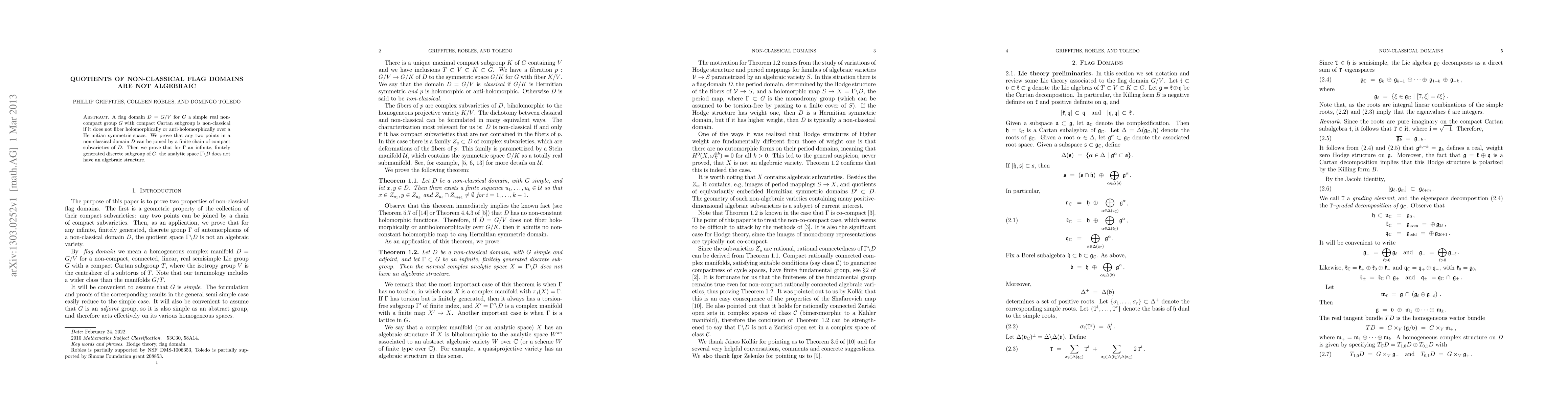 A flag domain D = G/V for G a simple real non-compact group G with compact Cartan subgroup is non-classical if it does not fiber holomorphically or anti-holomorphically over a Hermitian symmetric space. We prove that any two points in a non-classical domain D can be joined by a finite chain of compact subvarieties of D. Then we prove that for F an infinite, finitely generated discrete subgroup of G, the analytic space F\D does not have an algebraic structure.