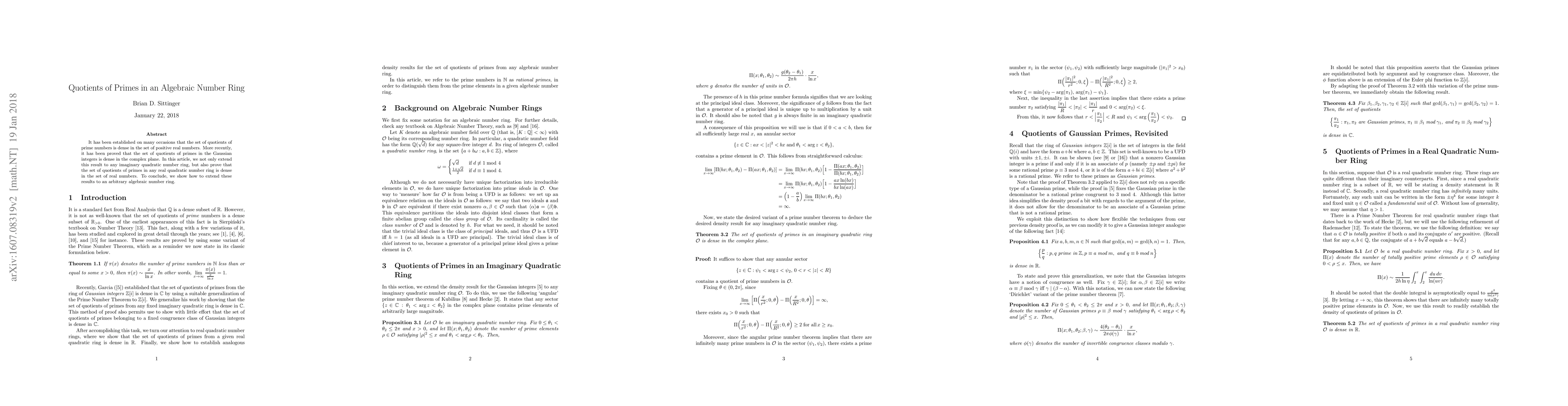 It has been established on many occasions that the set of quotients of prime numbers is dense in the set of positive real numbers. More recently, it has been proved that the set of quotients of primes in the Gaussian integers is dense in the complex plane. In this article, we not only extend this result to any imaginary quadratic number ring, but also prove that the set of quotients of primes in any real quadratic number ring is dense in the set of real numbers. To conclude, we show how to extend these results to an arbitrary algebraic number ring.
