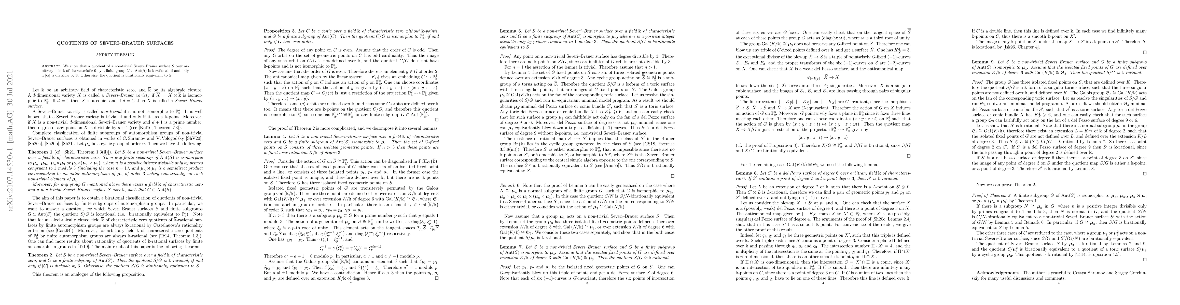 The paper demonstrates that a quotient of a non-trivial Severi-Brauer surface S over a characteristic 0 field k by a finite group G is rational if and only if the order of G is divisible by 3. Otherwise, the quotient is birationally equivalent to S, establishing a condition linking group order and rationality in such quotients.
