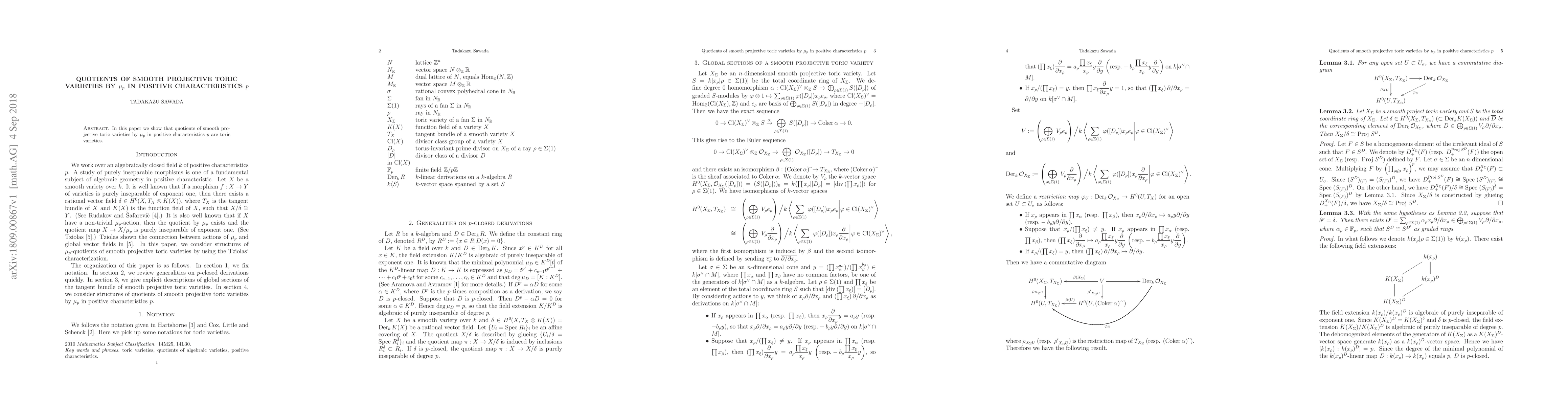Summary: This paper demonstrates that quotients of smooth projective toric varieties under the action of a cyclic group $\mu_p$ in positive characteristic $p$ remain toric varieties. The study highlights the structural preservation under such quotients.