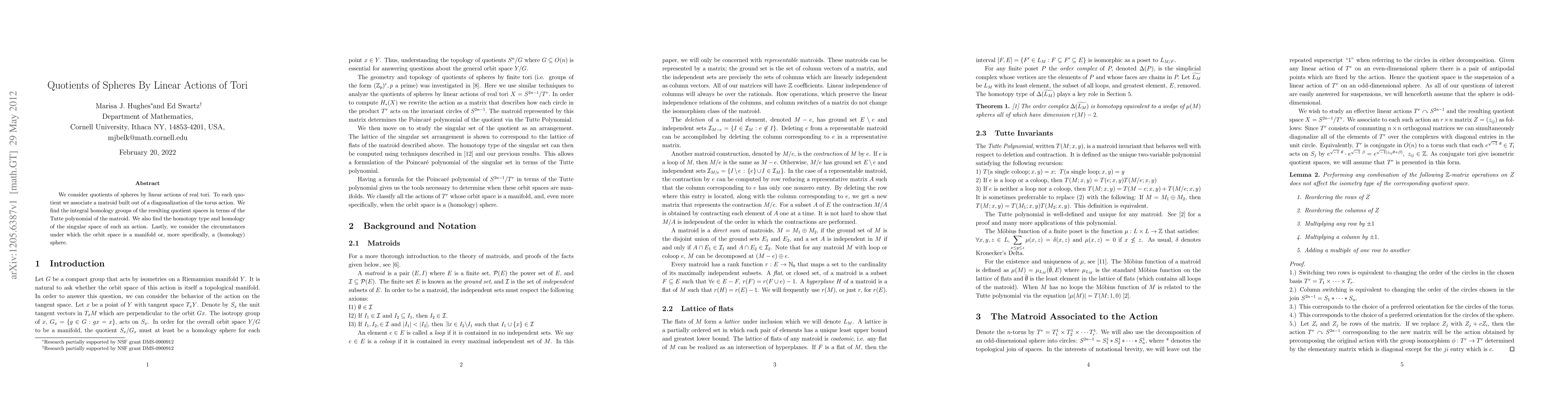 This research explores the quotients of spheres under linear actions of real tori, constructs associated matroids from the torus action, and determines their integral homology groups using the Tutte polynomial. It also investigates the conditions under which these quotient spaces are manifolds or homology spheres.