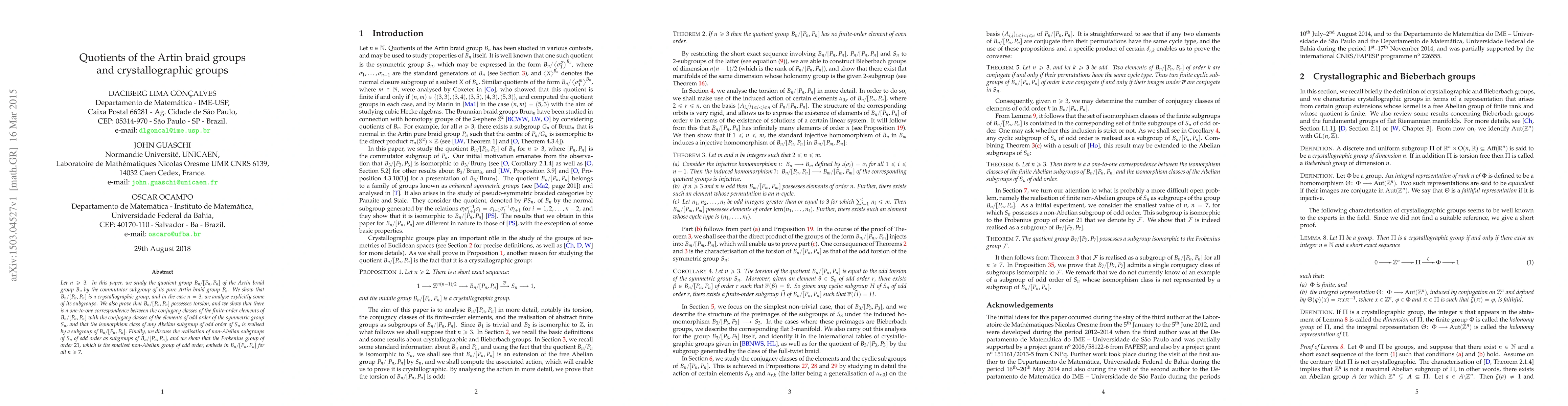 Researchers show that Artin braid group quotients can form crystallographic groups with properties related to symmetric group subgroups and embed non-Abelian groups of odd order, including the Frobenius group of order 21.