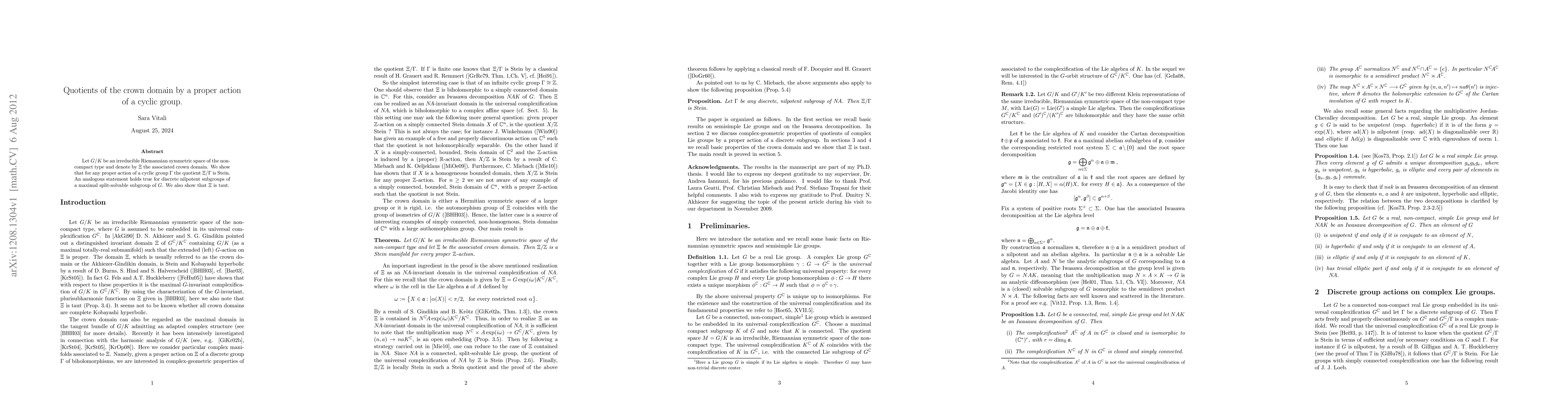 The paper shows that quotients of the crown domain by proper actions of cyclic groups are Stein spaces, with implications for the tautness of the domain itself.