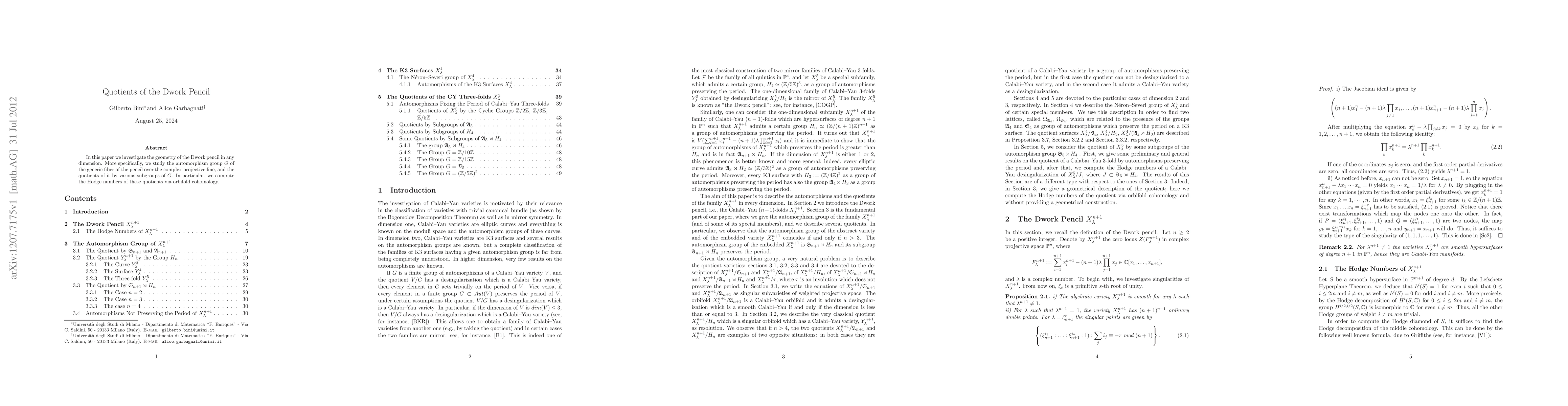 This paper explores the geometry of the Dwork pencil in any dimension, focusing on the automorphism group of its generic fiber and the quotients formed by various subgroups. It computes the Hodge numbers of these quotients using orbifold cohomology.