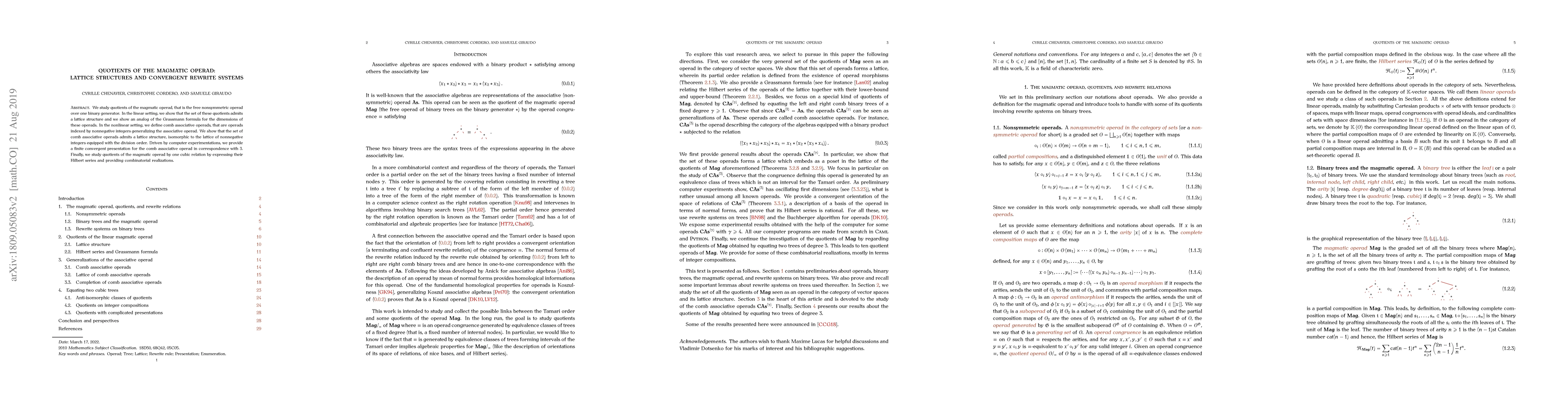 We study quotients of the magmatic operad, that is the free nonsymmetric operad over one binary generator. In the linear setting, we show that the set of these quotients admits a lattice structure and we show an analog of the Grassmann formula for the dimensions of these operads. In the nonlinear setting, we define comb associative operads, that are operads indexed by nonnegative integers generalizing the associative operad. We show that the set of comb associative operads admits a lattice structure, isomorphic to the lattice of nonnegative integers equipped with the division order. Driven by computer experimentations, we provide a finite convergent presentation for the comb associative operad in correspondence with~$3$. Finally, we study quotients of the magmatic operad by one cubic relation by expressing their Hilbert series and providing combinatorial realizations.