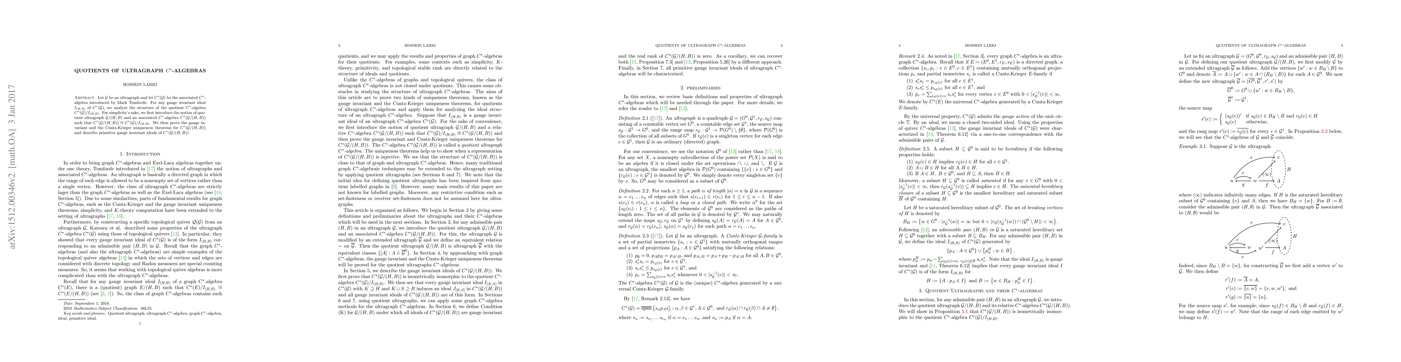Let $\mathcal{G}$ be an ultragraph and let $C^*(\mathcal{G})$ be the associated $C^*$-algebra introduced by Mark Tomforde. For any gauge invariant ideal $I_{(H,B)}$ of $C^*(\mathcal{G})$, we analyze the structure of the quotient $C^*$-algebra $C^*(\mathcal{G})/I_{(H,B)}$. For simplicity's sake, we first introduce the notion of quotient ultragraph $\mathcal{G}/(H,B)$ and an associated $C^*$-algebra $C^*(\mathcal{G}/(H,B))$ such that $C^*(\mathcal{G}/(H,B))\cong C^*(\mathcal{G})/I_{(H,B)}$. We then prove the gauge invariant and the Cuntz-Krieger uniqueness theorems for $C^*(\mathcal{G}/(H,B))$ and describe primitive gauge invariant ideals of $C^*(\mathcal{G}/(H,B))$.