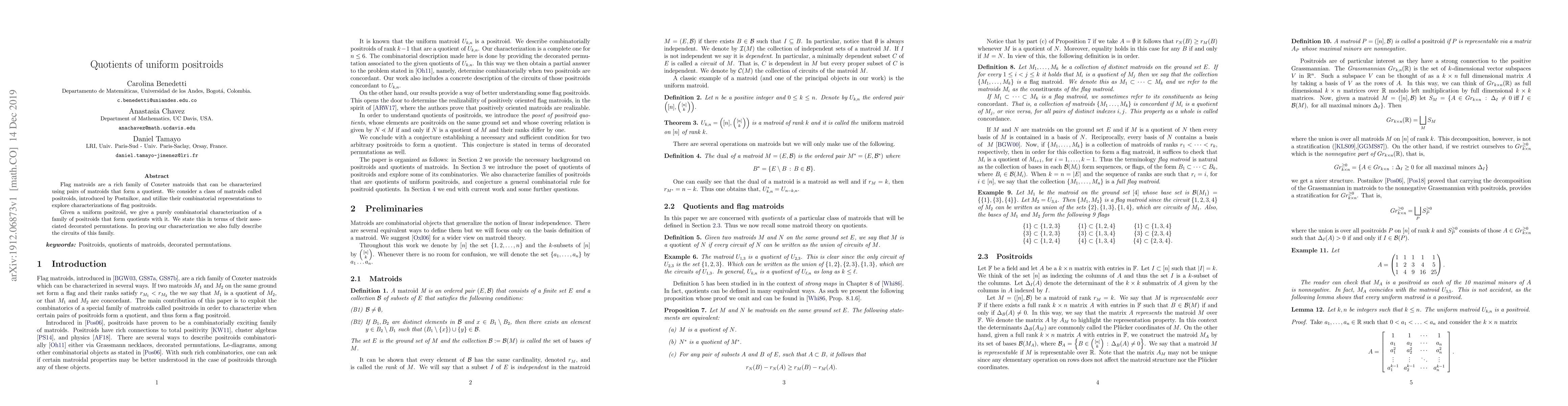 Flag matroids are a rich family of Coxeter matroids that can be characterized using pairs of matroids that form a quotient. We consider a class of matroids called positroids, introduced by Postnikov, and utilize their combinatorial representations to explore characterizations of flag positroids. Given a uniform positroid, we give a purely combinatorial characterization of a family of positroids that form quotients with it. We state this in terms of their associated decorated permutations. In proving our characterization we also fully describe the circuits of this family.