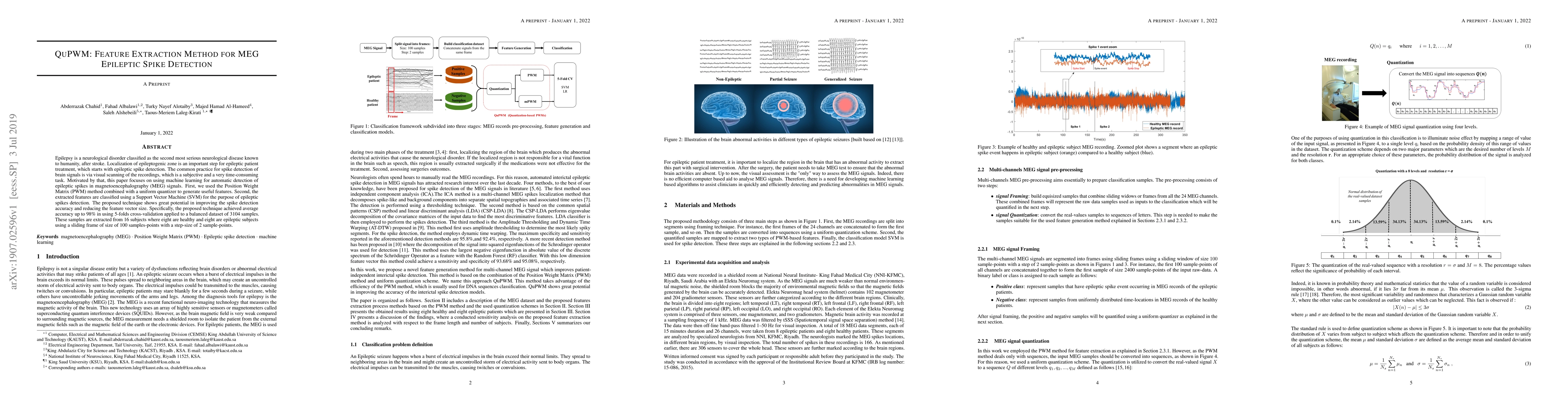 This paper proposes a machine learning method called QuPWM to automatically detect epileptic spikes in MEG signals, using feature extraction via Position Weight Matrix and classification with Support Vector Machine, achieving 98% accuracy. The method aims to replace subjective, time-consuming visual scanning of brain signal recordings.
