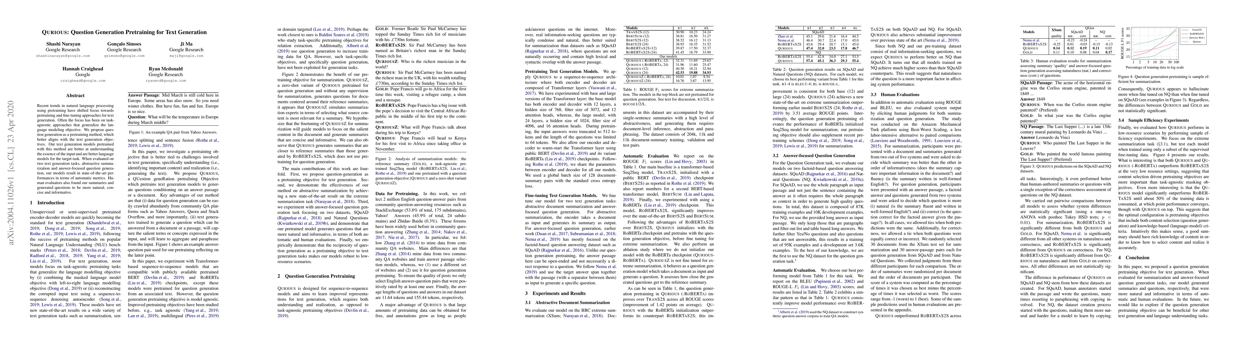 The QURIOUS method pretrains text generation models using question generation, achieving state-of-the-art performance in abstractive summarization and answer-focused question generation, with human evaluators noting improved naturalness and informativeness.