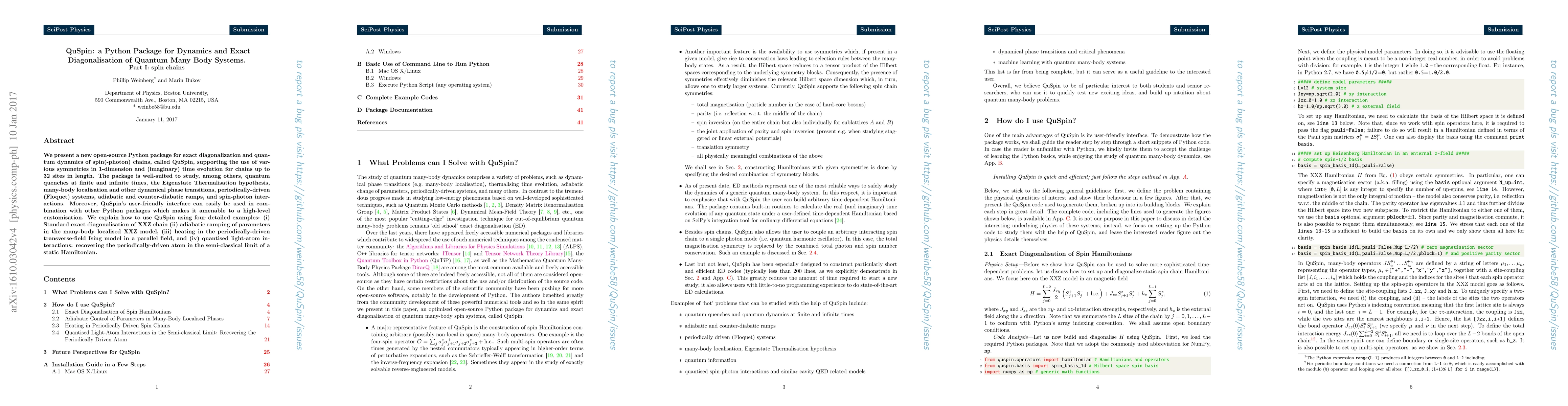 QuSpin is a Python package for studying quantum many-body systems, including spin chains, with features such as exact diagonalization and time evolution. It can simulate various physical phenomena like quantum quenches, thermalisation, and periodically-driven systems.