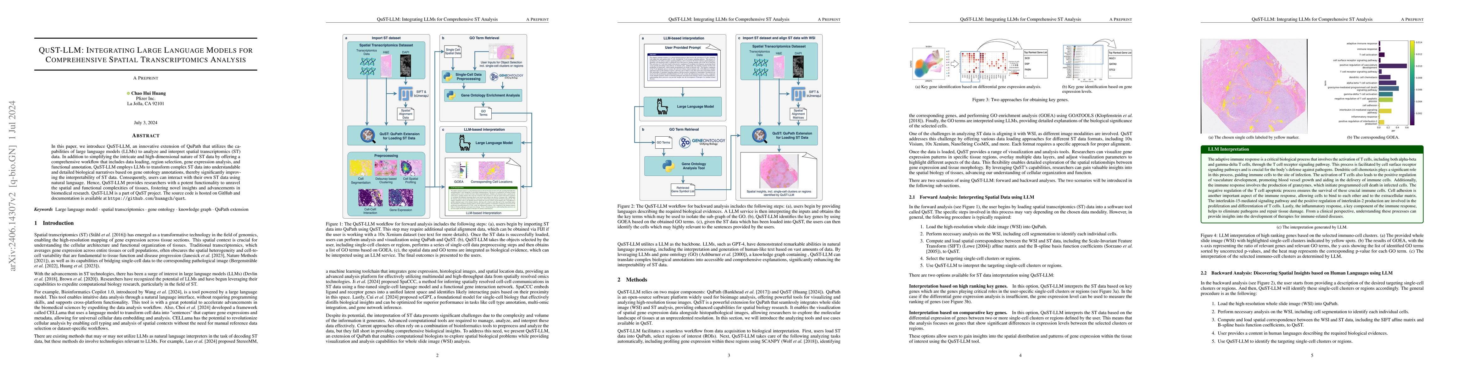 QuST-LLM integrates large language models to enhance spatial transcriptomics analysis in QuPath, offering a complete workflow for ST data and transforming complex data into comprehensible biological narratives, thus improving data interpretability and interaction through natural language. The tool fosters new insights in biomedical research, with its source code and documentation available on GitHub.