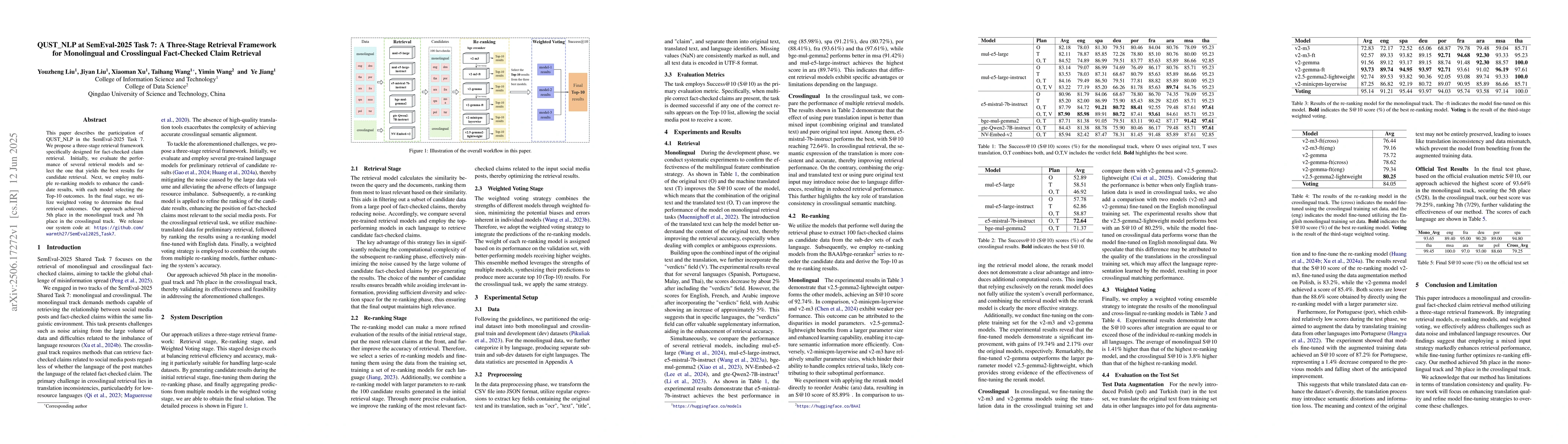 This paper describes the participation of QUST_NLP in the SemEval-2025 Task 7. We propose a three-stage retrieval framework specifically designed for fact-checked claim retrieval. Initially, we evaluate the performance of several retrieval models and select the one that yields the best results for candidate retrieval. Next, we employ multiple re-ranking models to enhance the candidate results, with each model selecting the Top-10 outcomes. In the final stage, we utilize weighted voting to determine the final retrieval outcomes. Our approach achieved 5th place in the monolingual track and 7th place in the crosslingual track. We release our system code at: https://github.com/warmth27/SemEval2025_Task7