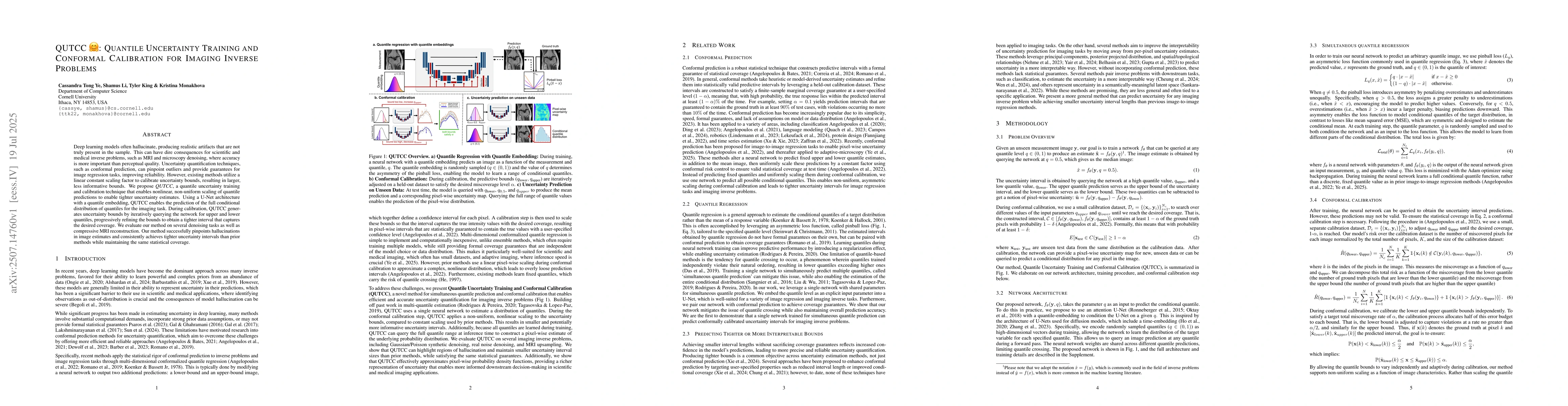 Deep learning models often hallucinate, producing realistic artifacts that are not truly present in the sample. This can have dire consequences for scientific and medical inverse problems, such as MRI and microscopy denoising, where accuracy is more important than perceptual quality. Uncertainty quantification techniques, such as conformal prediction, can pinpoint outliers and provide guarantees for image regression tasks, improving reliability. However, existing methods utilize a linear constant scaling factor to calibrate uncertainty bounds, resulting in larger, less informative bounds. We propose QUTCC, a quantile uncertainty training and calibration technique that enables nonlinear, non-uniform scaling of quantile predictions to enable tighter uncertainty estimates. Using a U-Net architecture with a quantile embedding, QUTCC enables the prediction of the full conditional distribution of quantiles for the imaging task. During calibration, QUTCC generates uncertainty bounds by iteratively querying the network for upper and lower quantiles, progressively refining the bounds to obtain a tighter interval that captures the desired coverage. We evaluate our method on several denoising tasks as well as compressive MRI reconstruction. Our method successfully pinpoints hallucinations in image estimates and consistently achieves tighter uncertainty intervals than prior methods while maintaining the same statistical coverage.