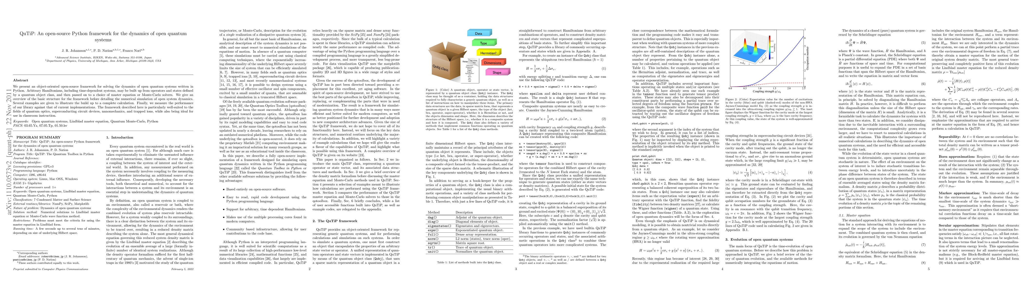 QuTiP is an open-source Python framework for simulating the dynamics of open quantum systems, supporting various solvers and Hamiltonians. It is designed for applications in quantum optics, superconducting circuits, and other quantum technologies, and is also useful for educational purposes.
