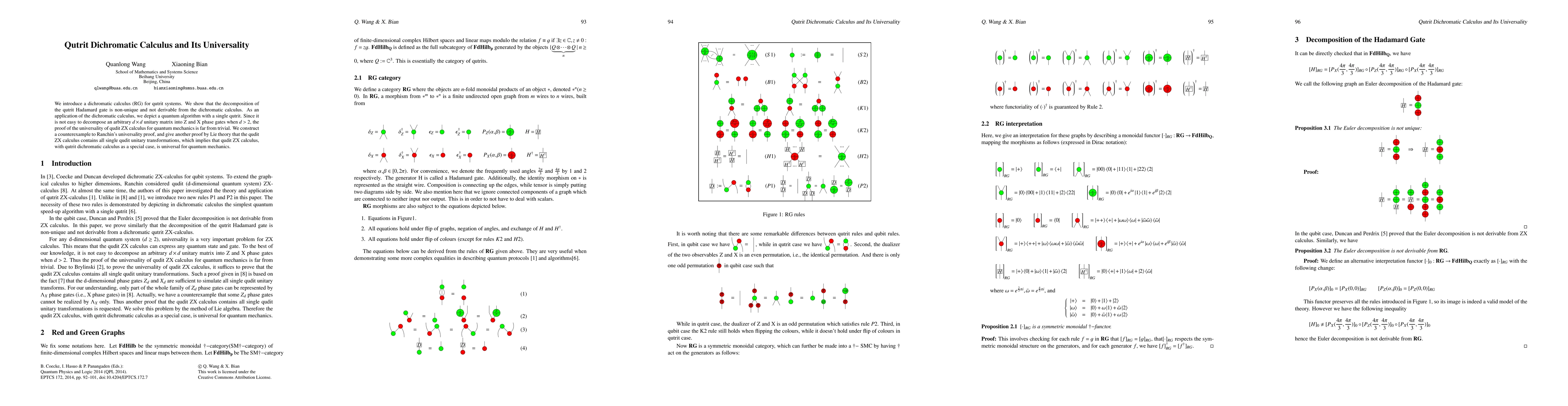 We introduce a dichromatic calculus (RG) for qutrit systems. We show that the decomposition of the qutrit Hadamard gate is non-unique and not derivable from the dichromatic calculus. As an application of the dichromatic calculus, we depict a quantum algorithm with a single qutrit. Since it is not easy to decompose an arbitrary d by d unitary matrix into Z and X phase gates when d > 2, the proof of the universality of qudit ZX calculus for quantum mechanics is far from trivial. We construct a counterexample to Ranchin's universality proof, and give another proof by Lie theory that the qudit ZX calculus contains all single qudit unitary transformations, which implies that qudit ZX calculus, with qutrit dichromatic calculus as a special case, is universal for quantum mechanics.