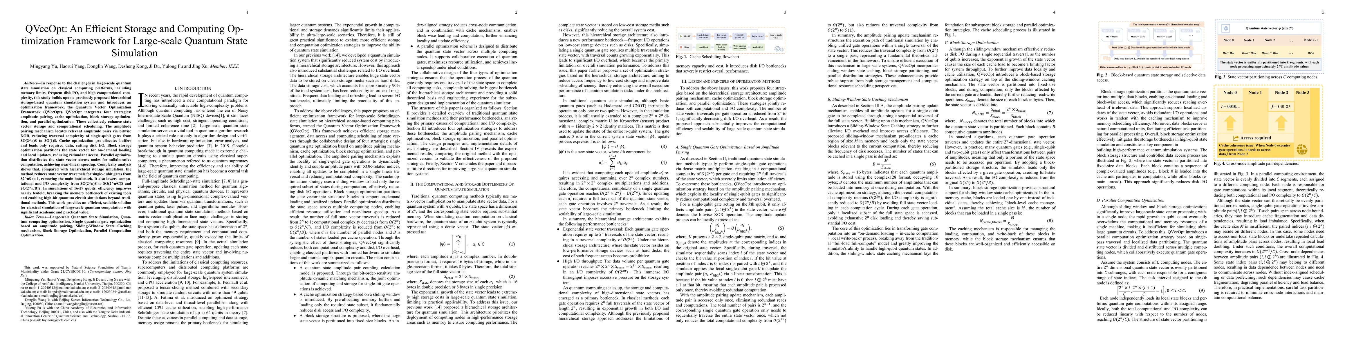 In response to the challenges in large-scale quantum state simulation on classical computing platforms, including memory limits, frequent disk I/O, and high computational complexity, this study builds upon a previously proposed hierarchical storage-based quantum simulation system and introduces an optimization framework, the Quantum Vector Optimization Framework (QVecOpt). QVecOpt integrates four strategies: amplitude pairing, cache optimization, block storage optimization, and parallel optimization. These collectively enhance state vector storage and computational scheduling. The amplitude pairing mechanism locates relevant amplitude pairs via bitwise XOR, reducing traversal complexity of single-qubit gates from $O(2^n)$ to $O(1)$. Cache optimization pre-allocates buffers and loads only required data, cutting disk I/O. Block storage optimization partitions the state vector for on-demand loading and local updates, reducing redundant access. Parallel optimization distributes the state vector across nodes for collaborative computation, achieving near-linear speedup. Complexity analysis shows that, compared with hierarchical storage simulation, the method reduces state vector traversals for single-qubit gates from $2^n$ to 1, removing the main bottleneck. It also lowers computational and I/O complexity from $O(2^n)$ to $O(2^n/C)$ and $O(2^n/B)$. In simulations of 16-29 qubits, efficiency improves nearly tenfold, breaking the memory bottleneck of existing tools and enabling high-bit quantum circuit simulations beyond traditional methods. This work provides an efficient, scalable solution for classical simulation of large-scale quantum computation with significant academic and practical value.