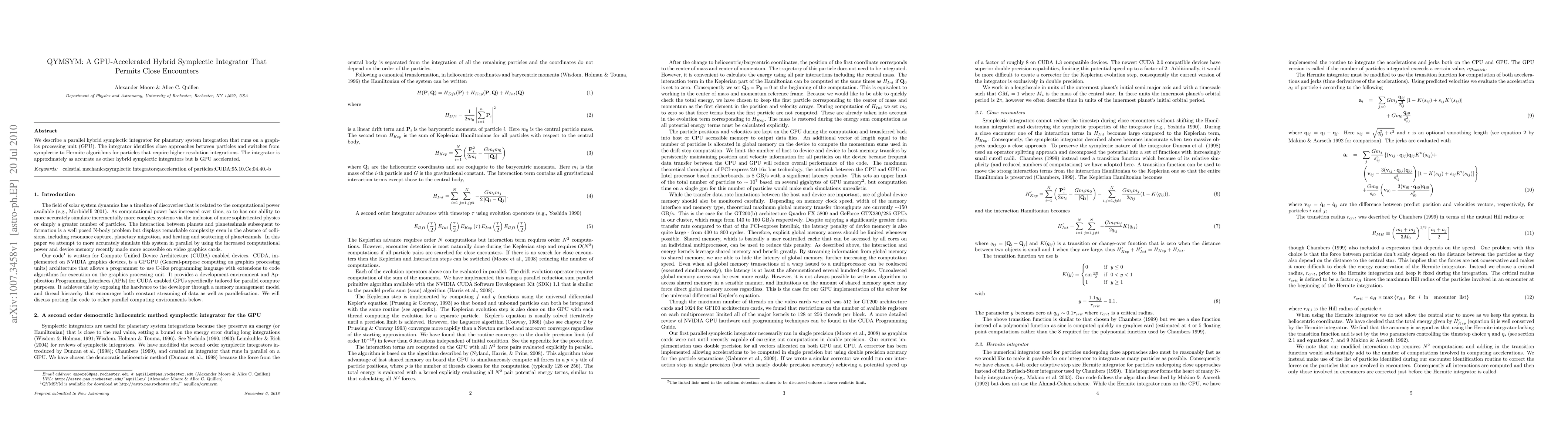 Title: QYMSYM: A GPU-Accelerated Hybrid Symplectic Integrator That Permits Close Encounters Summary: This paper presents a GPU-accelerated hybrid symplectic integrator for planetary system simulations, switching to Hermite algorithms for high-resolution integrations during close encounters, maintaining accuracy comparable to other hybrid methods.