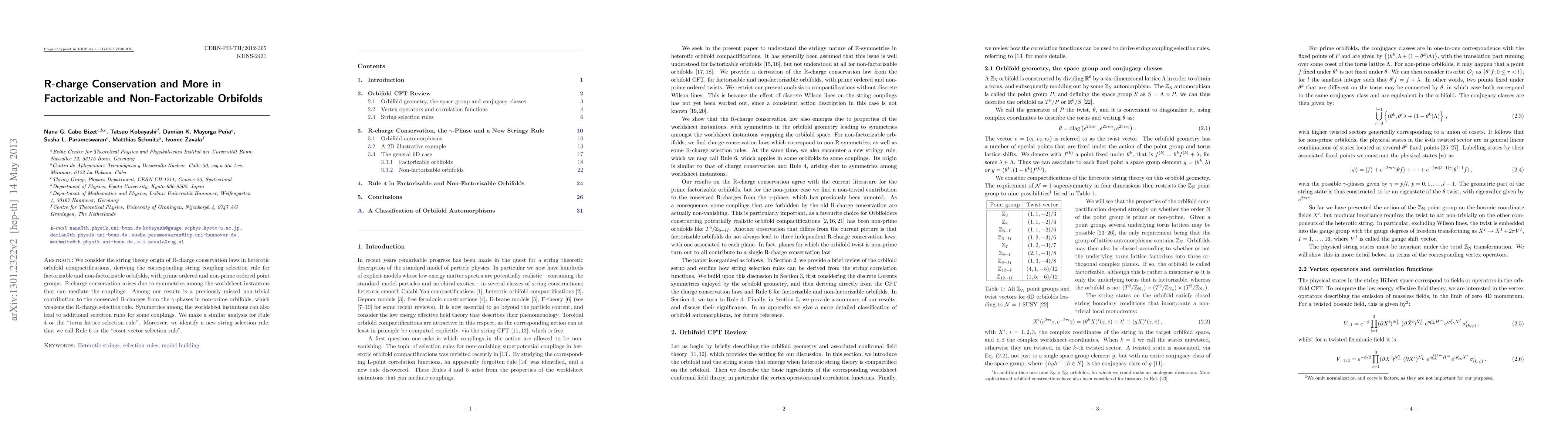 This paper explores R-charge conservation laws in heterotic orbifold compactifications, deriving new string coupling selection rules for both factorizable and non-factorizable orbifolds. It identifies a previously overlooked contribution to conserved R-charges from Gamma-phases in non-prime orbifolds, which modifies the R-charge selection rule.