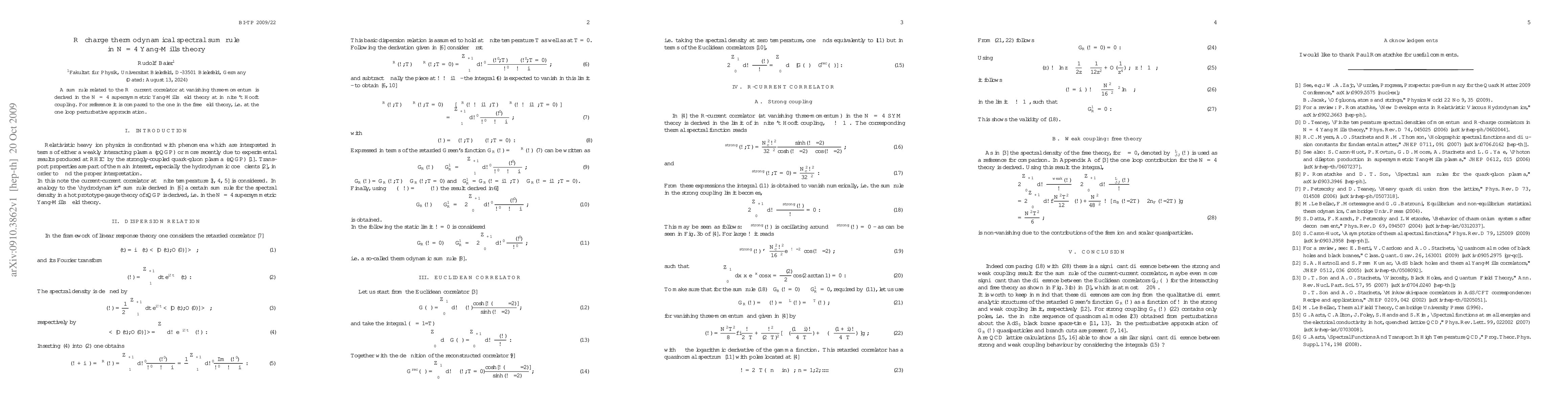 A sum rule related to the R-current correlator at vanishing three-momentum is derived in the N=4 supersymmetric Yang-Mills field theory at infinite 't Hooft coupling. For reference it is compared to the one in the free field theory, i.e. at the one loop perturbative approximation.