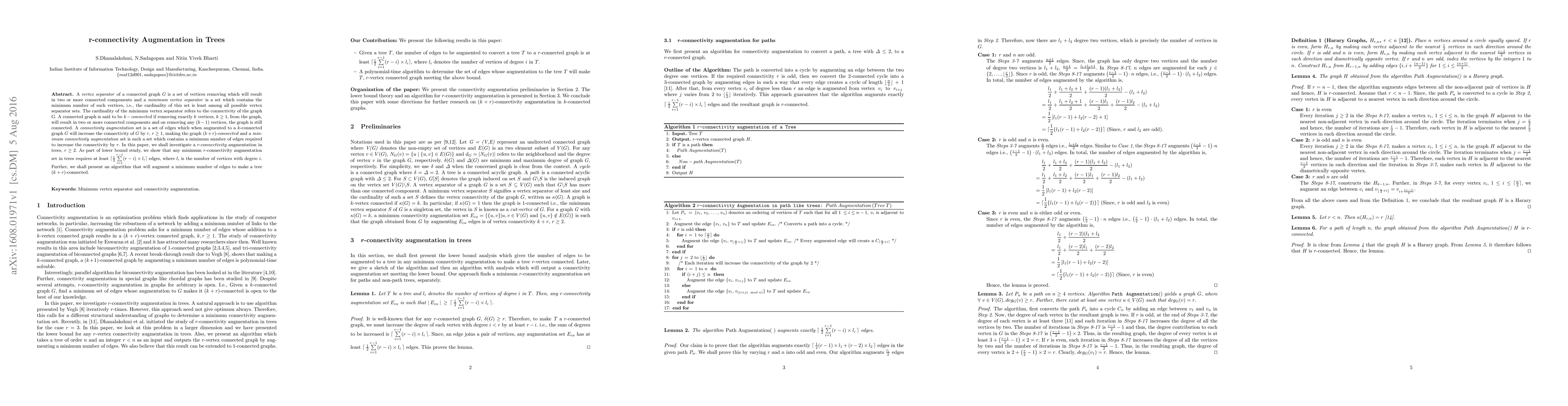 This paper investigates the augmentation of $r$-connectivity in trees, where $r \geq 2$. It establishes a lower bound for the minimum number of edges required for such augmentation and presents an algorithm to achieve this augmentation with the least number of edges.